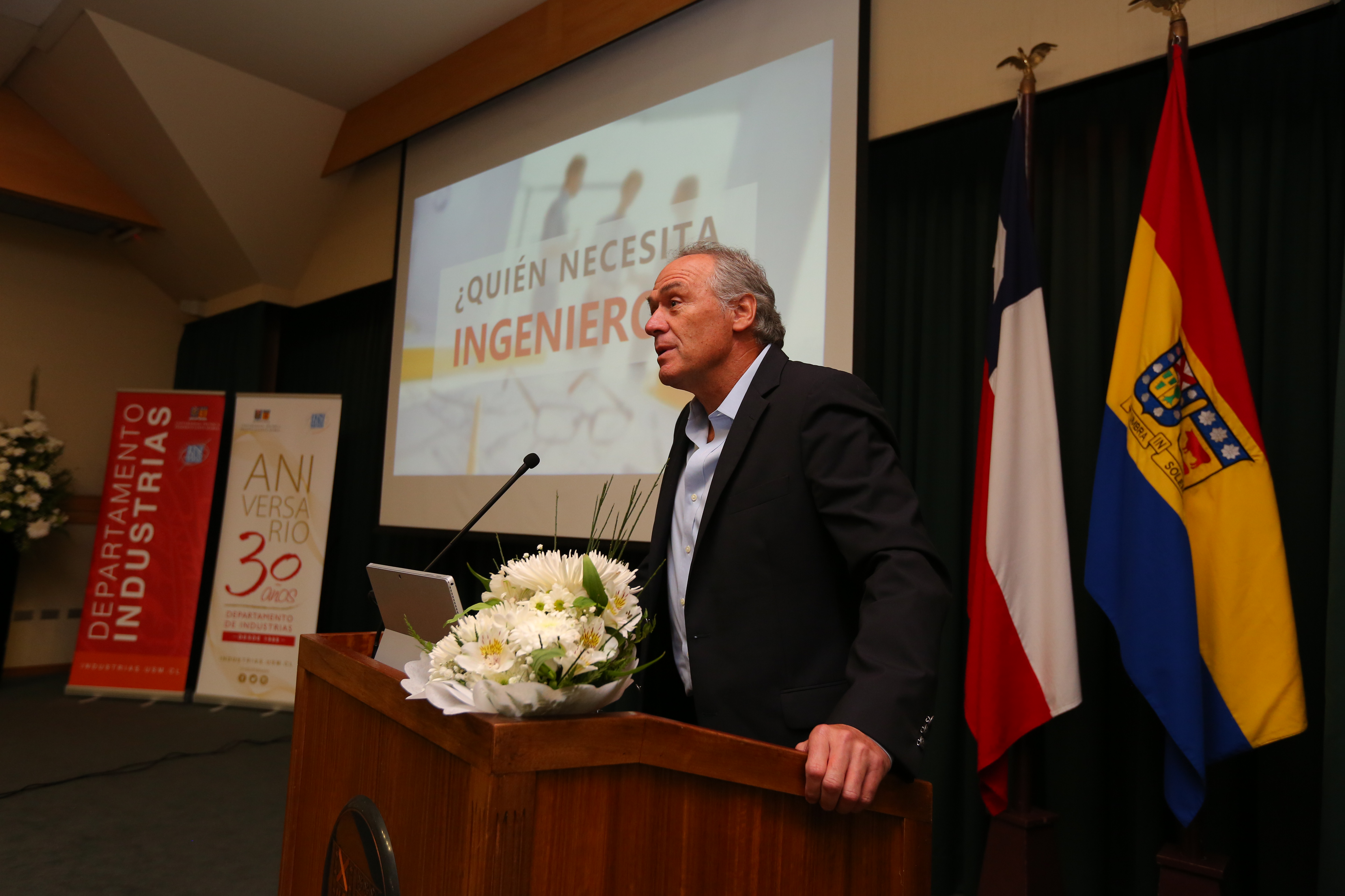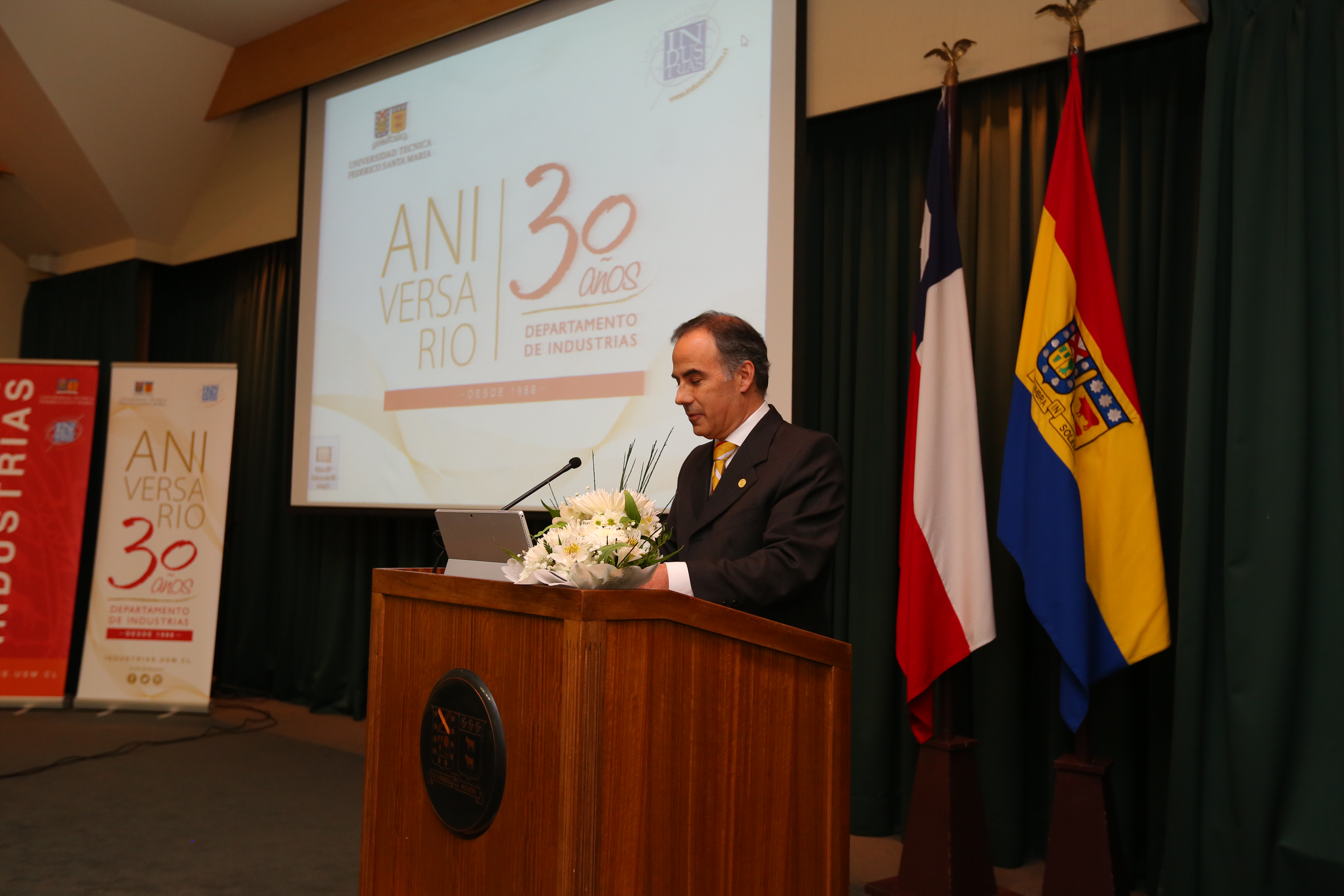 A cargo de entregar las palabras que dieran inicio a esta celebración, el Director del Departamento de Industrias, Dr. Cristóbal Fernández Robin destacó el crecimiento exponencial que ha vivido la Unidad Académica en los 30 años desde su oficialización, transformándose en una de las más dinámicas del país dentro del ámbito de la formación en Ingeniería Industrial.