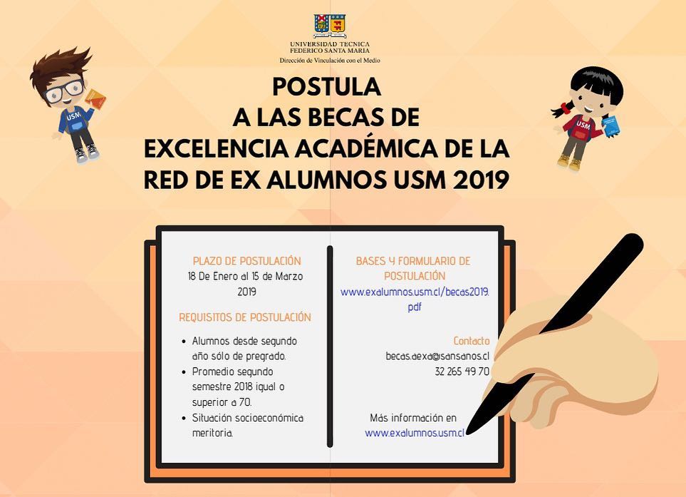 Las bases y formulario de postulación se encuentran en el siguiente link: http://www.exalumnos.usm.cl/becas2019.pdf