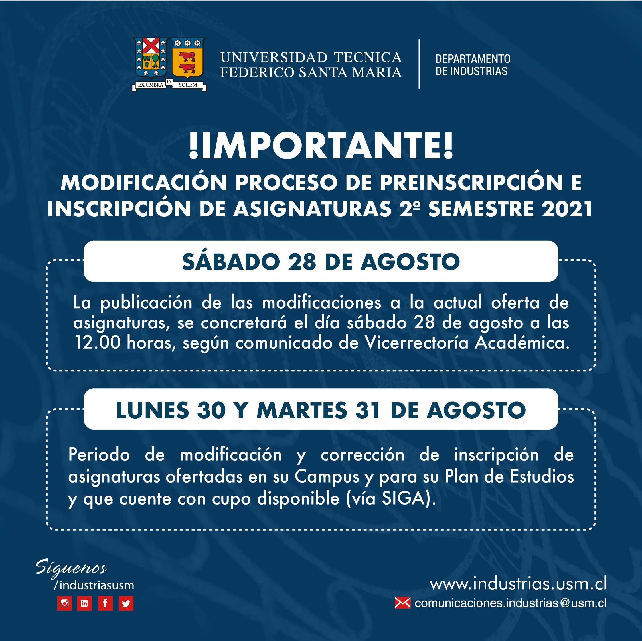 Actualización Periodo de Modificación y Corrección de Inscripción de Asignaturas, 2º Semestre 2021