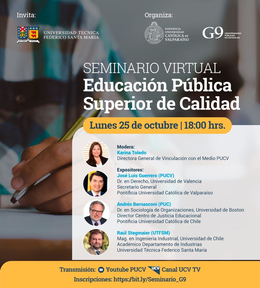 Te invitamos a participar del Seminario «Educación Pública Superior de Calidad» este lunes 25 de octubre a las 18.00 horas, que contará con la participación del Académico del Departamento de Industrias y Consejero Superior de la Universidad Técnica Federico Santa María, MSc. Raúl Stegmaier Bravo.