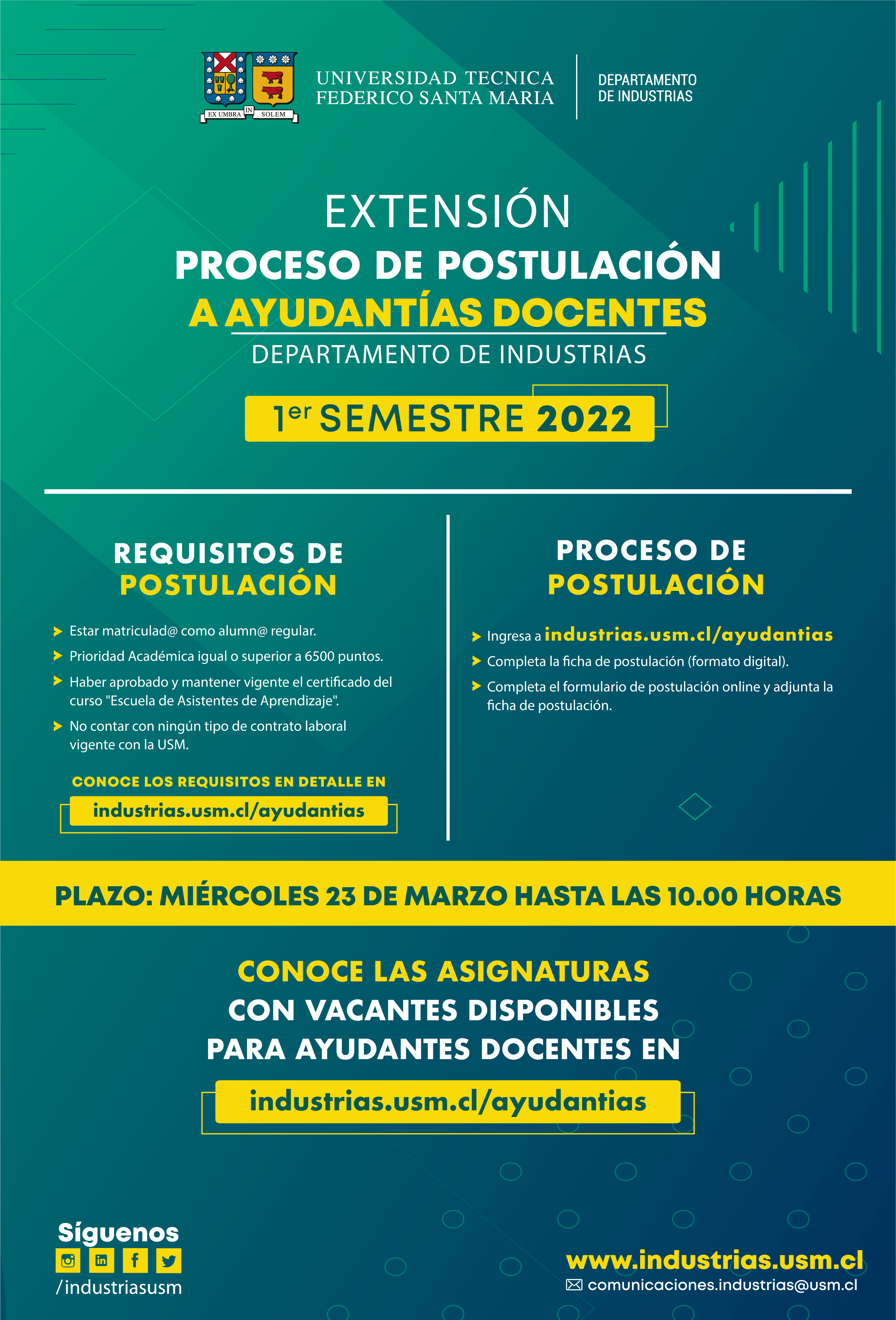 Extensión Proceso de Postulación a Ayudantías Docentes del Departamento de Industrias – 1er Semestre 2022