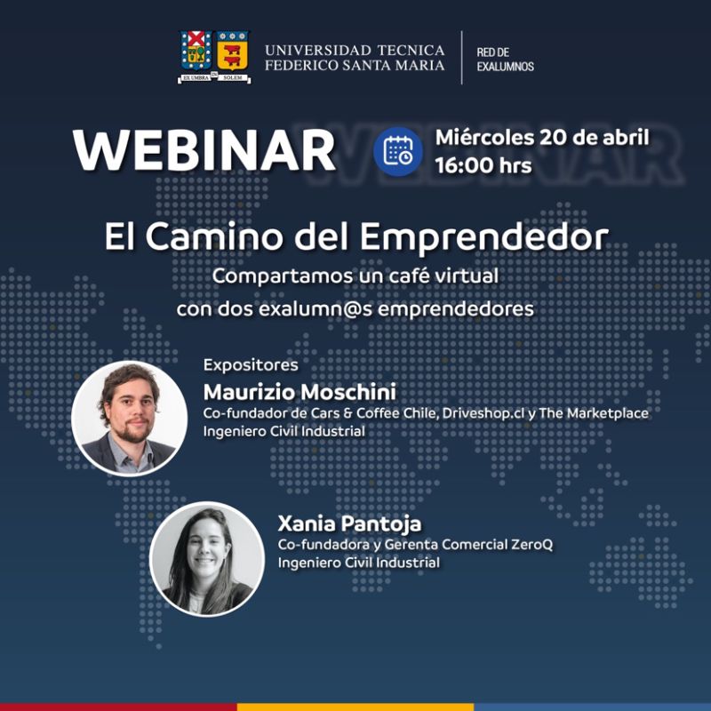 La Red Alumni USM te invita a participar del Webinar “El Camino del Emprendedor”, donde compartirás con dos Sansan@s Emprendedor@s y exalumn@s de Ingeniería Civil Industrial: