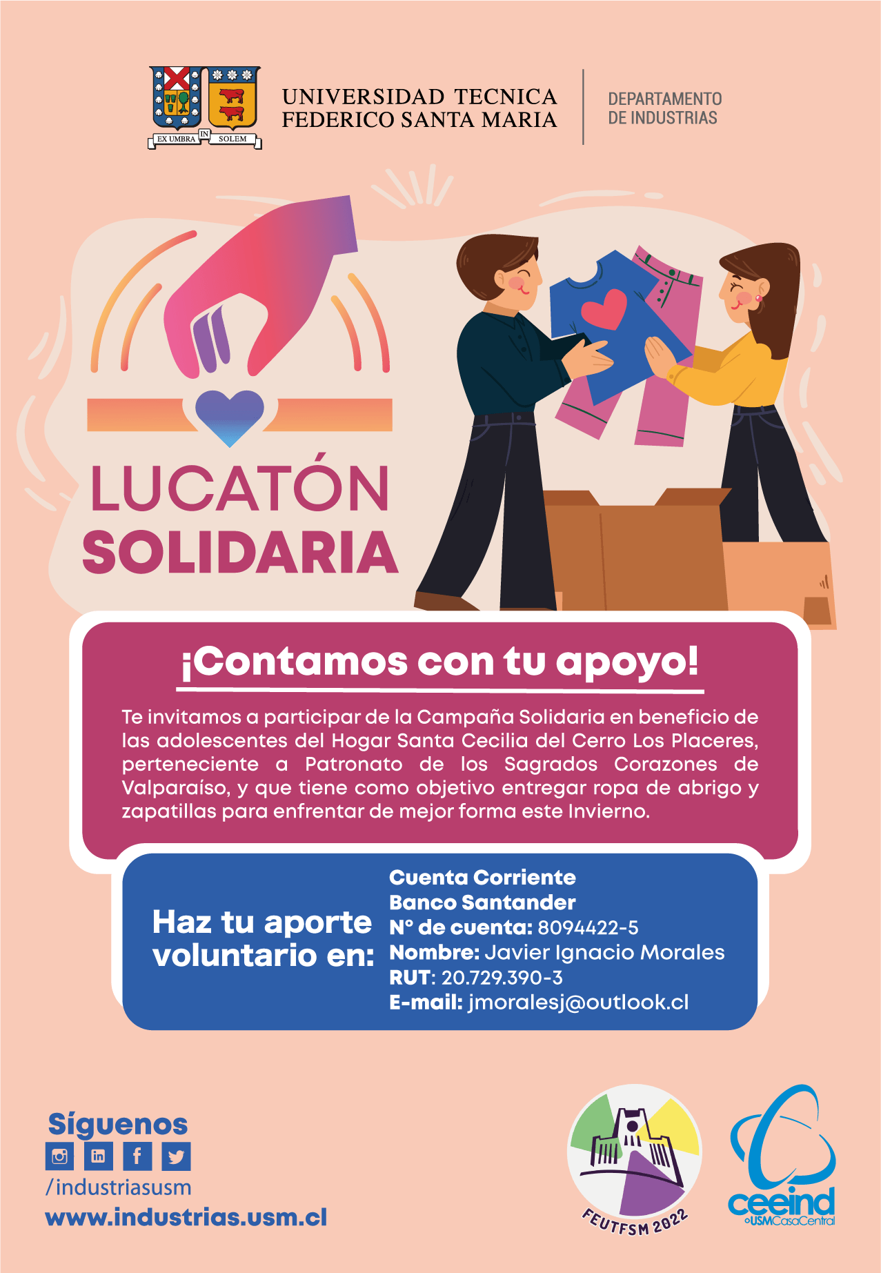 El Centro de Estudiantes de Ingeniería Civil Industrial de Campus Casa Central Valparaíso y la Federación de Estudiantes UFTSM Campus Casa Central Valparaíso, con el apoyo del Departamento de Industrias USM, te invitan a participar de la Lucatón Solidaria, campaña que tiene como objetivo reunir fondos para así entregar ropa de abrigo y zapatillas a las adolescentes que forman parte del Hogar Santa Cecilia del Cerro Los Placeres, perteneciente a Patronato de los Sagrados Corazones de Valparaíso.