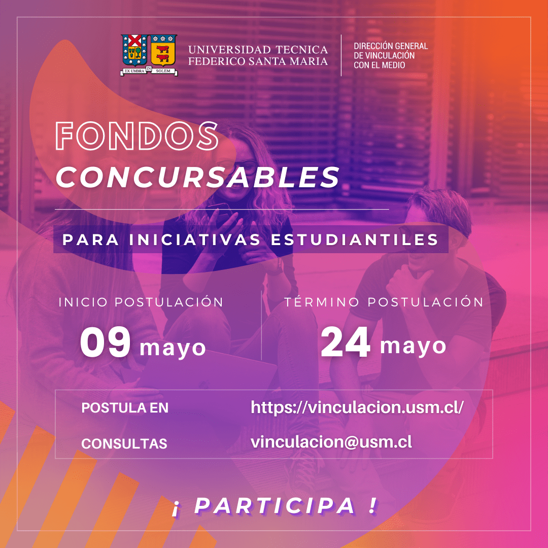 La Dirección de Vinculación con el Medio convoca a toda la comunidad estudiantil a participar de los Fondos Concursables Iniciativas Estudiantiles 2022-3, los cuales tienen como objetivo promover, gestionar y coordinar la realización de actividades que contribuyan al desarrollo de los y las estudiantes de la USM a través de la ejecución de iniciativas de vinculación con el medio de impacto que favorezcan el desarrollo de sus competencias transversales.