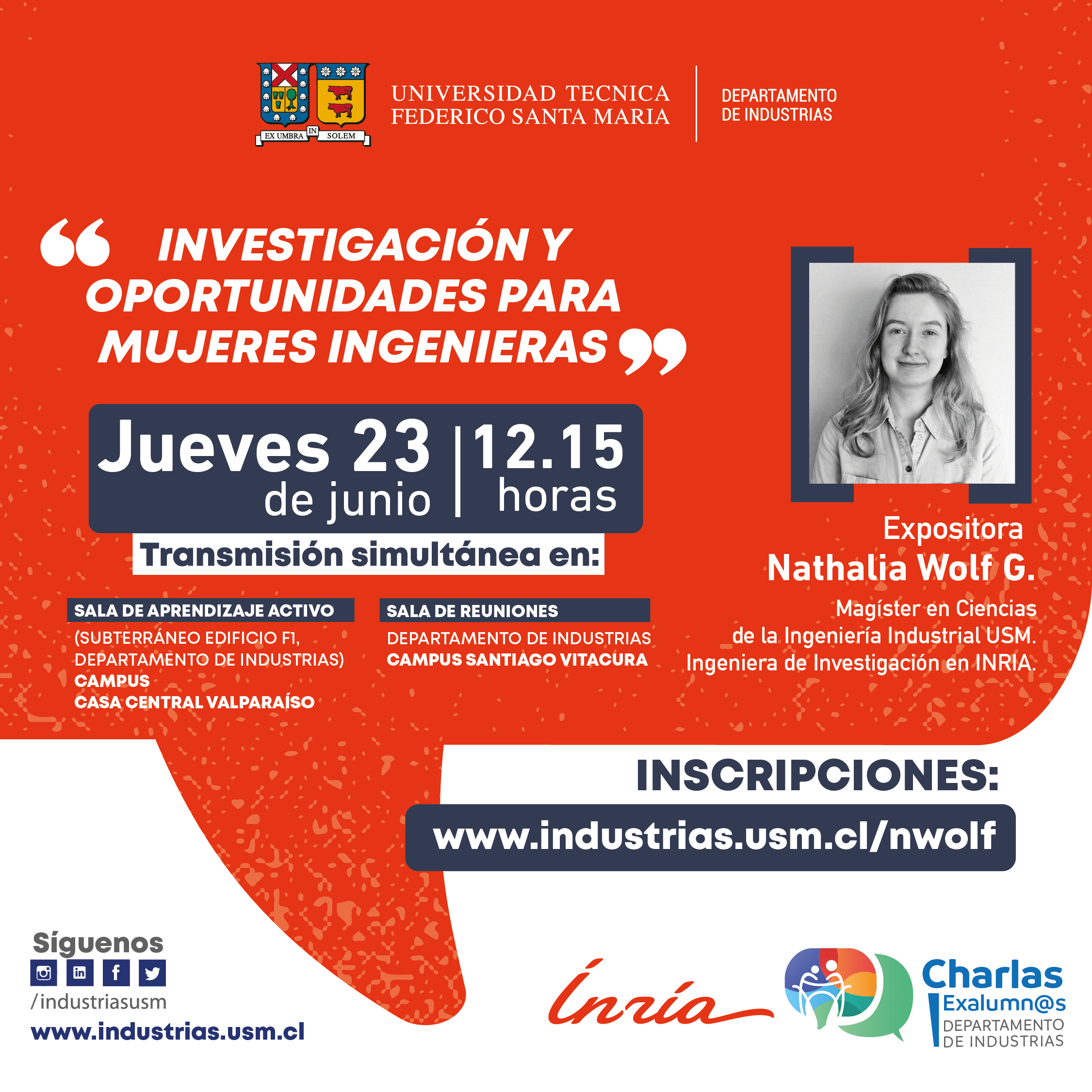 En esta ocasión, la exalumna Nathalia Wolf García, Magíster en Ciencias de la Ingeniería Industrial e Ingeniera Civil Industrial USM, quien se desempeña como Ingeniería de Investigación en el Instituto Francés de Investigación en Ciencias y Tecnologías Digitales – INRIA – en Francia, nos presentará a través de la charla «Investigación y Oportunidades para Mujeres Ingenierias» su experiencia personal como mujer e ingeniera respecto de su elección por especializarse a través del Magíster en Ciencias de la Ingeniería Industrial y el dedicarse a la investigación en una institución internacional, además de presentar los trabajos que se encuentra desarrollando.