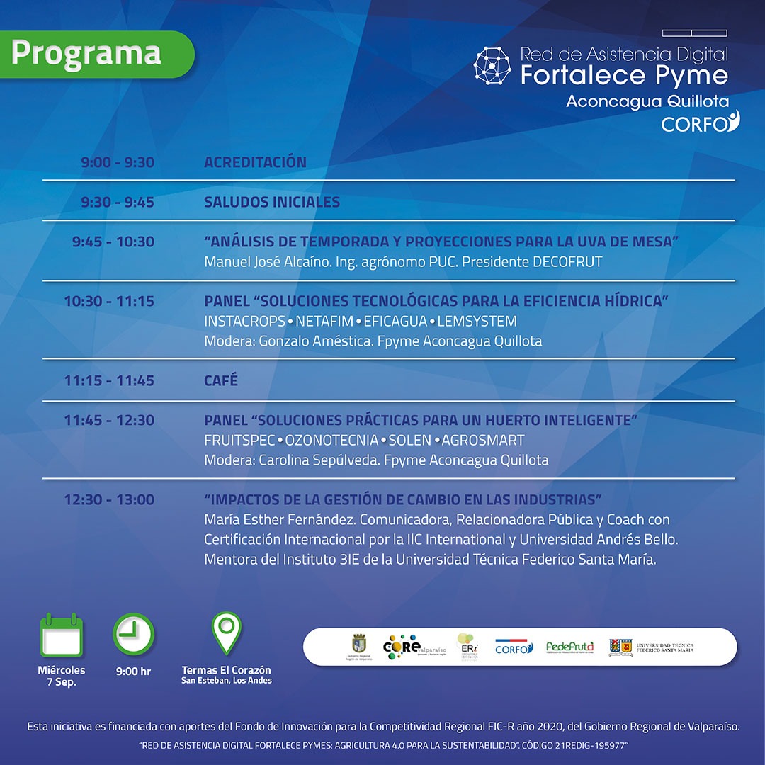 Te invitamos a participar del Seminario «Transformación Digital: Agricultura Competitiva ante Entornos Desafiantes», el miércoles 07 de septiembre de 2022, de 09.00 a 12.00 horas en modalidad presencial en el Hotel Termas del Corazón (San Esteban), organizado por la Red de Asistencia Digital Fortalece Pyme Aconcagua – Quillota y donde el Departamento de Industrias de la Universidad Técnica Federico Santa María es un socio estratégico.