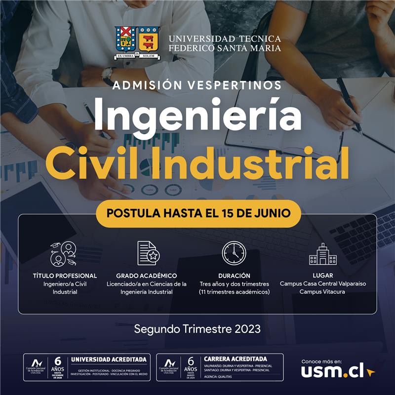 ¡Últimos cupos! Admisión 2º Trimestre 2023 Ingeniería Civil Industrial Vespertino – ICIPEV USM
