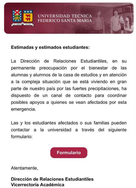 La Dirección de Relaciones Estudiantiles, en su permanente preocupación por el bienestar de las alumnos y alumnos de la Casa de Estudios y en atención a la compleja situación que se está viviendo en gran parte de nuestro país por las fuertes precipitaciones, ha dispuesto de un canal de contacto para coordinar posibles apoyos a quienes se ven afectados por esta emergencia.