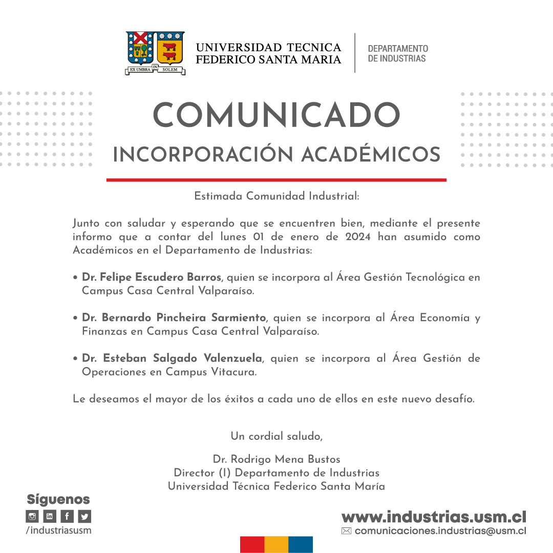 Informamos de la incorporación de 3 Académicos al Departamento de Industrias, quienes se integran a la unidad académica como profesores jornada completa.