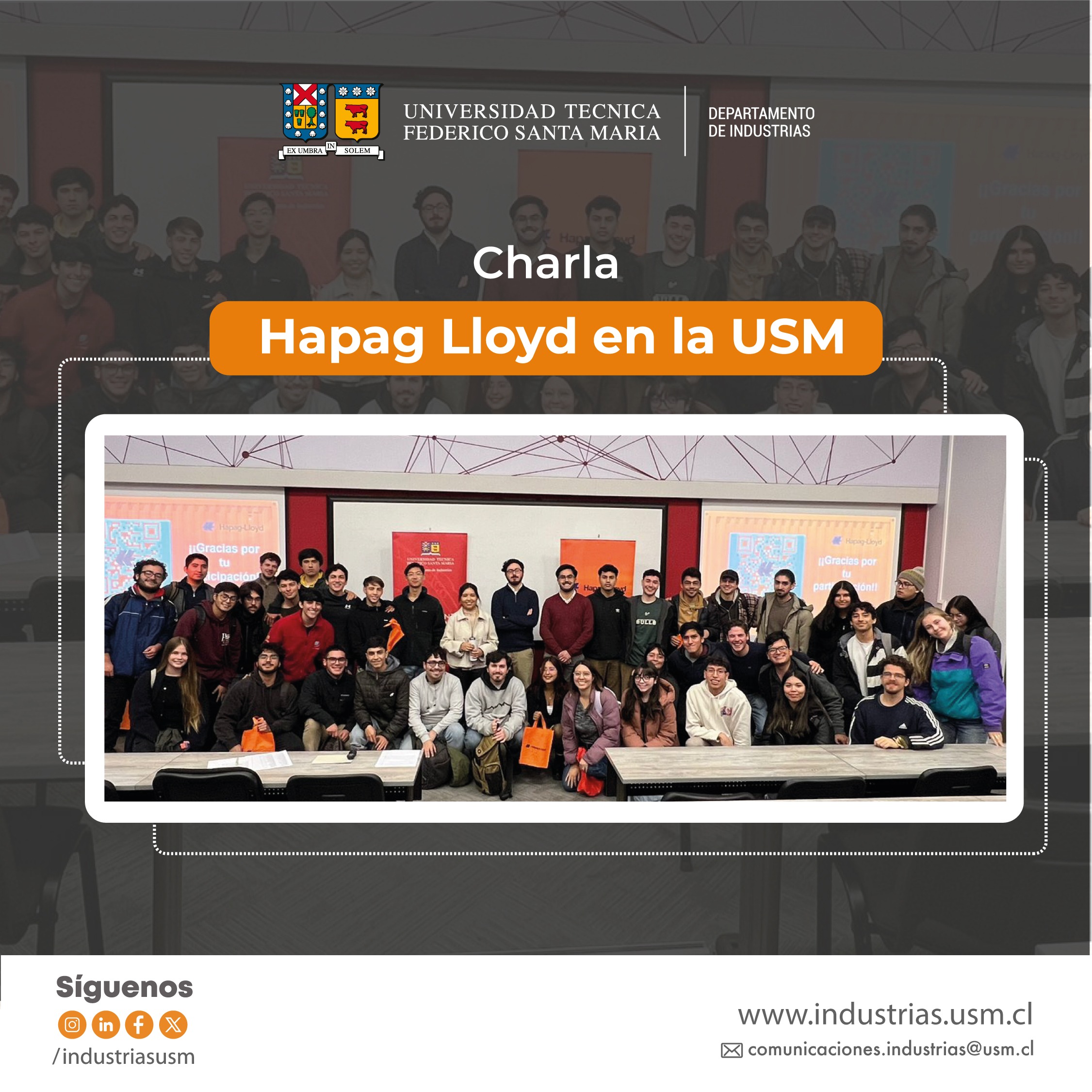 La empresa naviera Hapag Lloyd A.G. visitó el Campus Casa Central Valparaíso de la Universidad Técnica Federico Santa María para reunirse con estudiantes, egresados(as) y titulados(as) de Ingeniería Civil Industrial y a la comunidad universitaria, tuvo por objetivo presentar el quehacer de la organización y las alternativas de desarrollo profesional que existen al interior de la compañía, mediante una charla que contó con la participación de cerca de 50 asistentes.