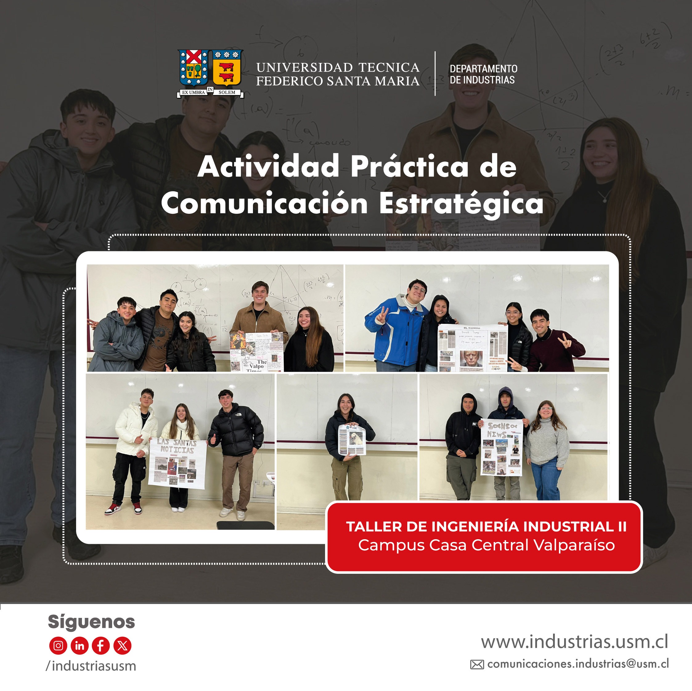 En el marco de la asignatura de Taller de Ingeniería Industrial II (ILN-011), estudiantes de Ingeniería Civil Industrial de Campus Casa Central Valparaíso desarrollaron y presentaron el trabajo práctico “Comunicación Estratégica: la importancia de los medios de comunicación”, mediante el cual aplicaron conocimientos y habilidades relacionadas a liderazgo, trabajo en equipo y creatividad, haciendo uso de materiales reciclados para lograr una comunicación efectiva de un tema contingente.