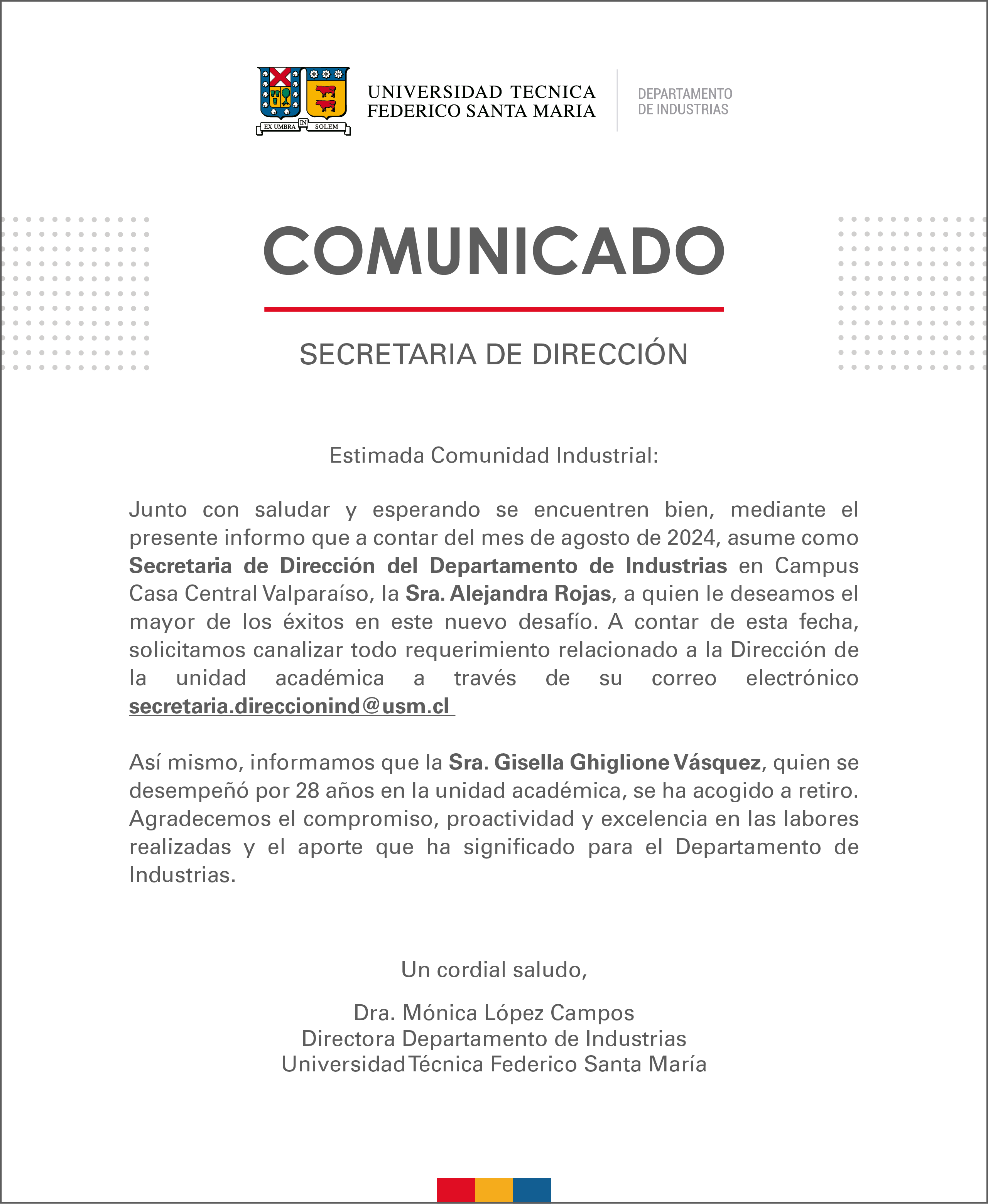 A contar del mes de agosto de 2024 la Sra. Alejandra Rojas Rojas asume como Secretaria de Dirección del Departamento de Industrias. Te invitamos a canalizar los requerimientos asociados a la Dirección de la Unidad Académica a través de su correo electrónico secretaria.direccionind@usm.cl o acudir presencialmente a su oficina ubicada en el 1er piso del Edificio F1.