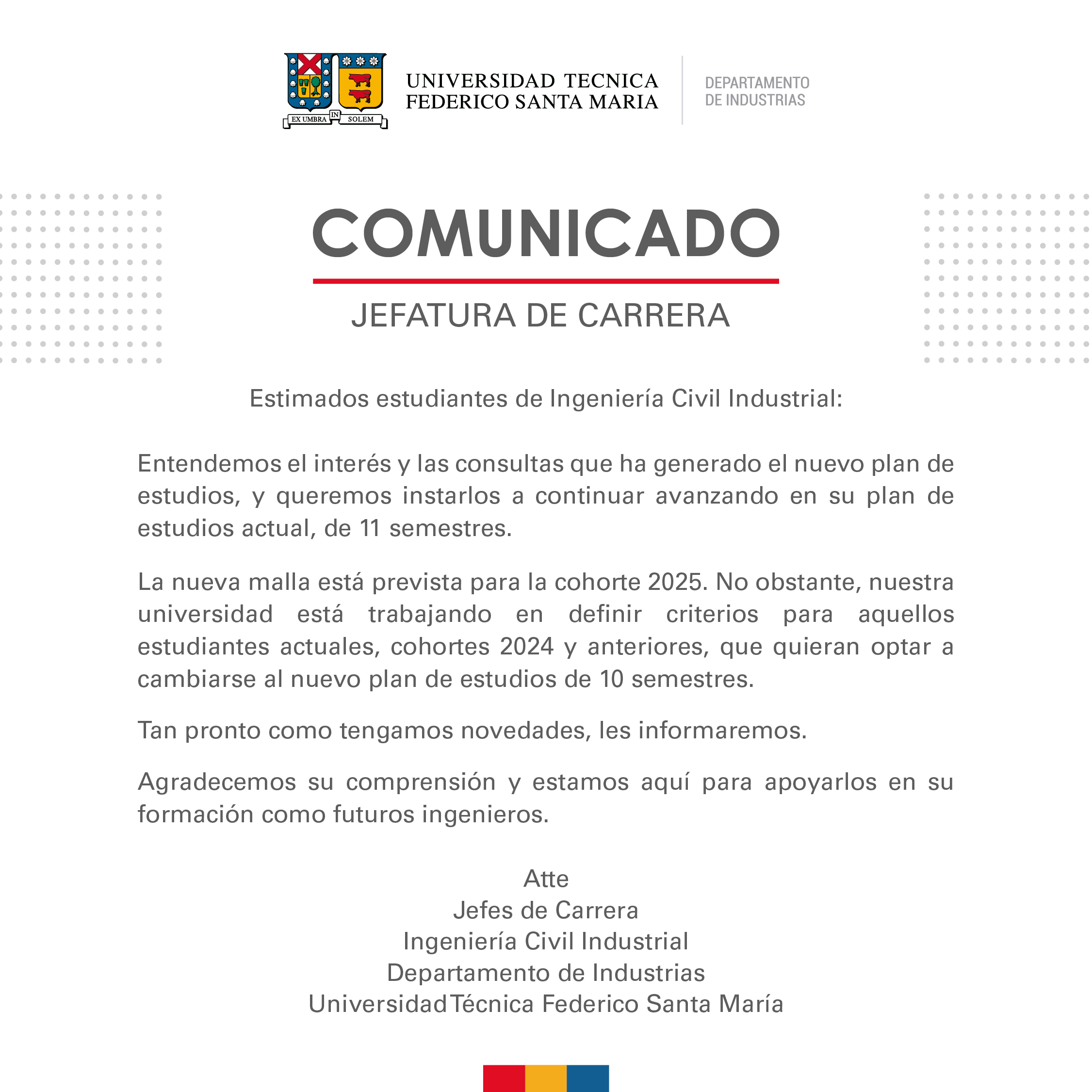 Comunicado Jefatura de Carrera: Nueva Malla Ingeniería Civil Industrial y Estudiantes Cohorte 2024 o anterior