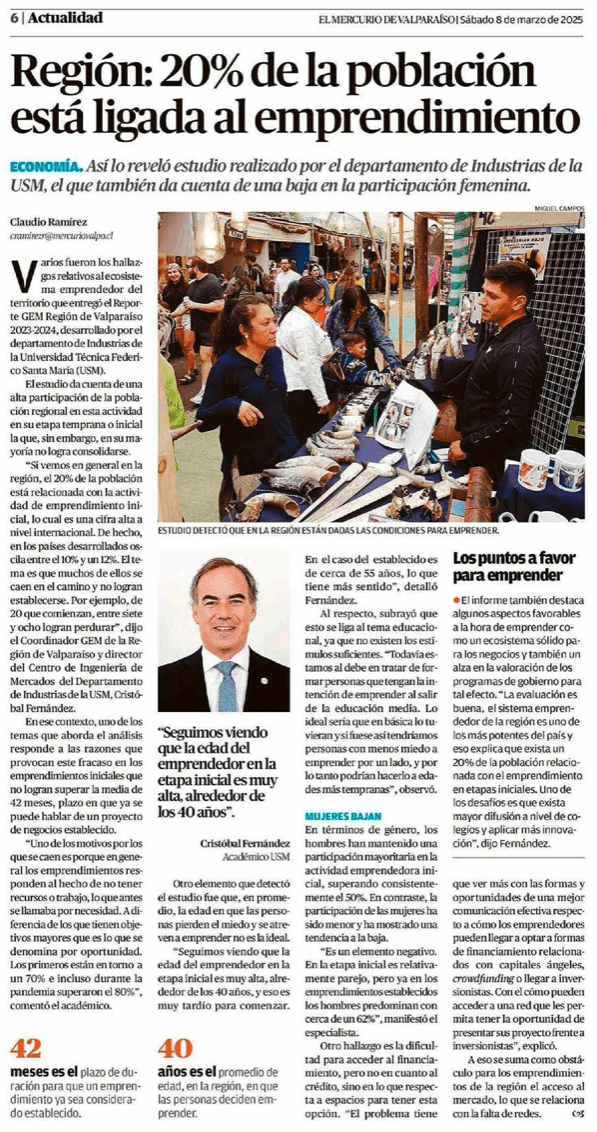 “Región: 20% de la población está ligada al emprendimiento” – Entrevista Mercurio de Valparaíso, Dr. Cristóbal Fernández Robin