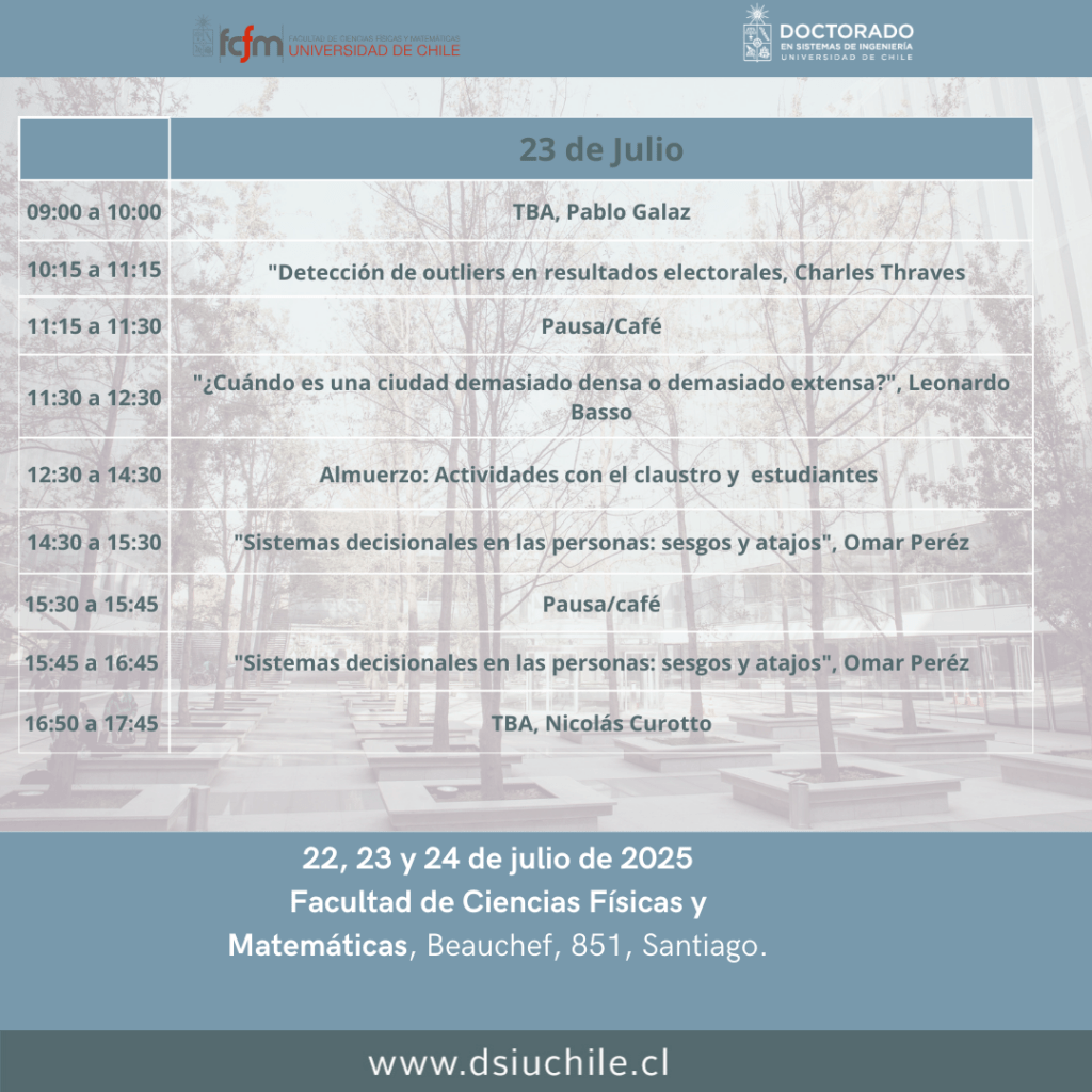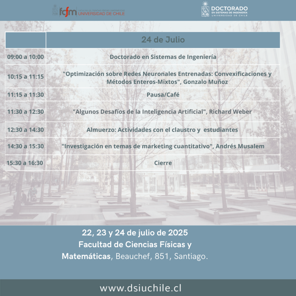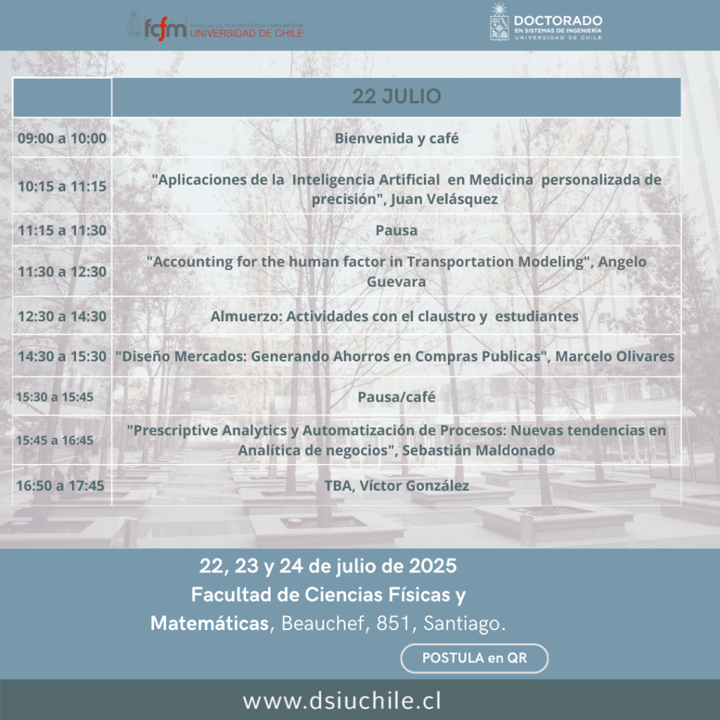 La 14º Escuela de Invierno en Sistemas de Ingeniería se desarrollará entre el 22 y 24 de Julio de 2025 en la Facultad de Ciencias Físicas y Matemáticas de la Universidad de Chile (Beauchef 851, Santiago).
