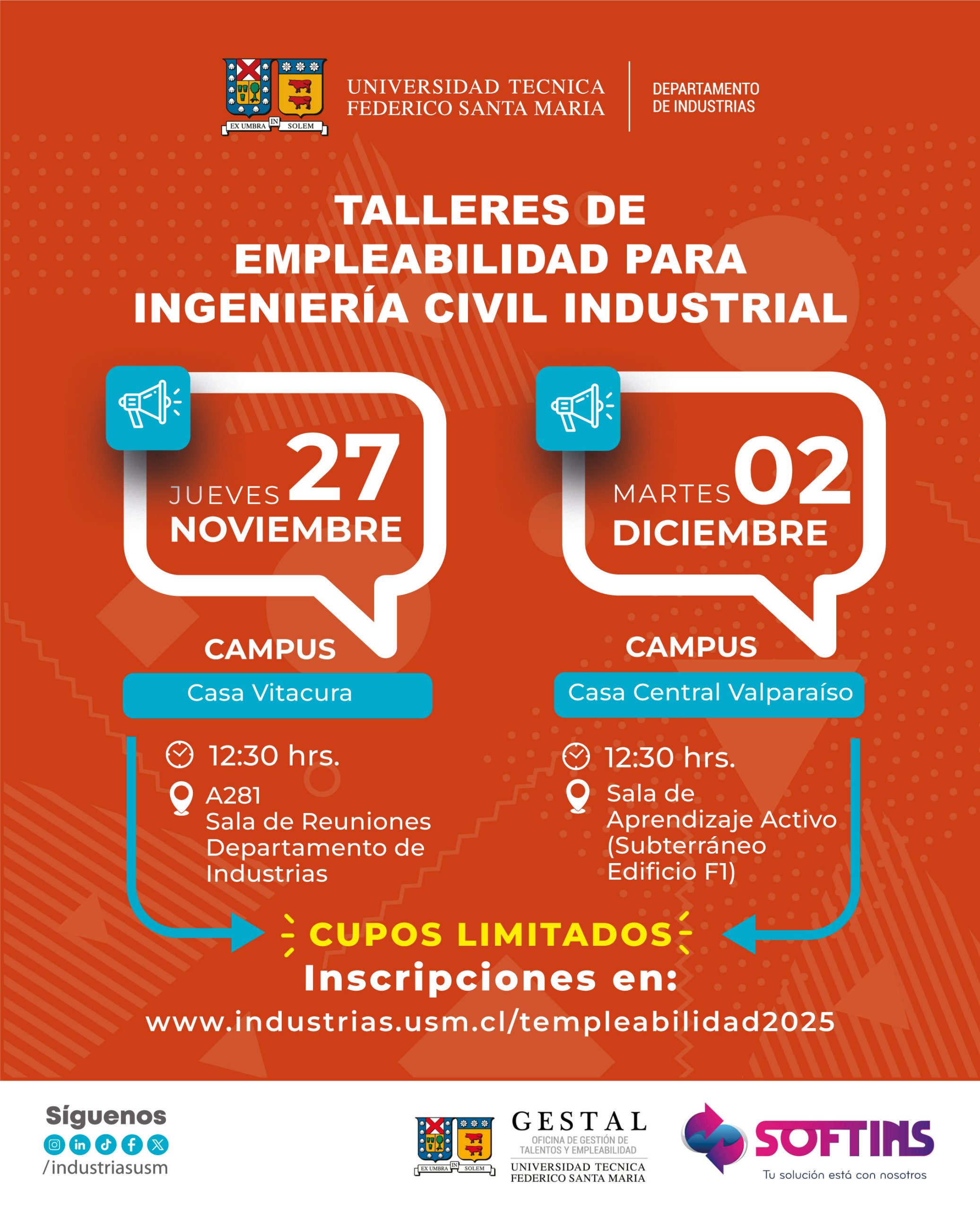 ¿Eres estudiante de Ingeniería Civil Industrial USM? Te invitamos a participar de los Talleres de Empleabilidad donde, de la mano de la Oficina de Gestión de Talentos y Empleabilidad – GESTAL USM – y Soft Ins, descubrirás cómo desarrollarte de mejor manera en el campo laboral al momento de buscar tu práctica, memoria o empleo.