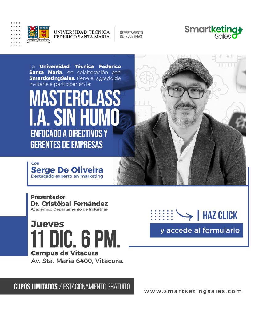 El Departamento de Industrias de la Universidad Técnica Federico Santa María, en colaboración con SmartketingSales, te invitan a participar de la charla “IA SIN HUMO” a cargo de Serge De Oliveira, destacado experto en marketing con más de 25 años de trayectoria y premiado en múltiples ocasiones por su impacto en la industria.