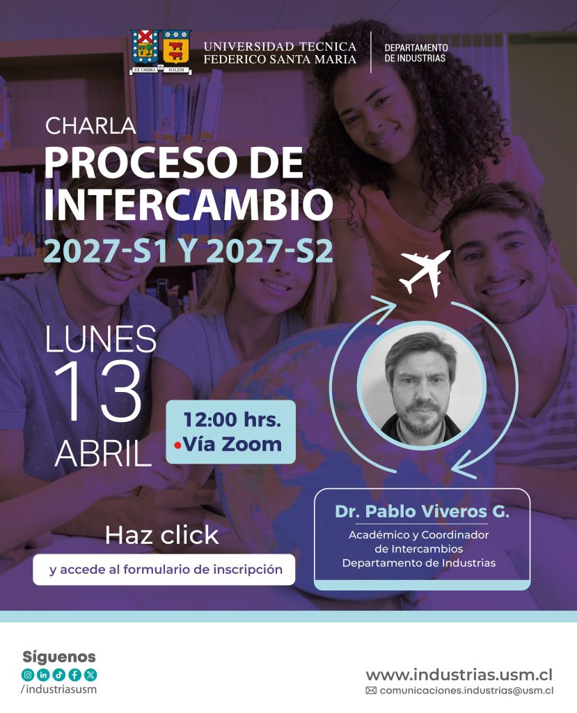 Si estás cursando Ingeniería Civil Industrial te invitamos a participar de la Charla Informativa sobre el Proceso de Intercambio Internacional que realizará el Coordinador de Intercambios del Departamento de Industrias, Dr. Pablo Viveros G., donde podrás conocer mayor información sobre el proceso, el procedimiento para convalidar las asignaturas, los documentos que debes gestionar con el Coordinador de Intercambios, entre otros.