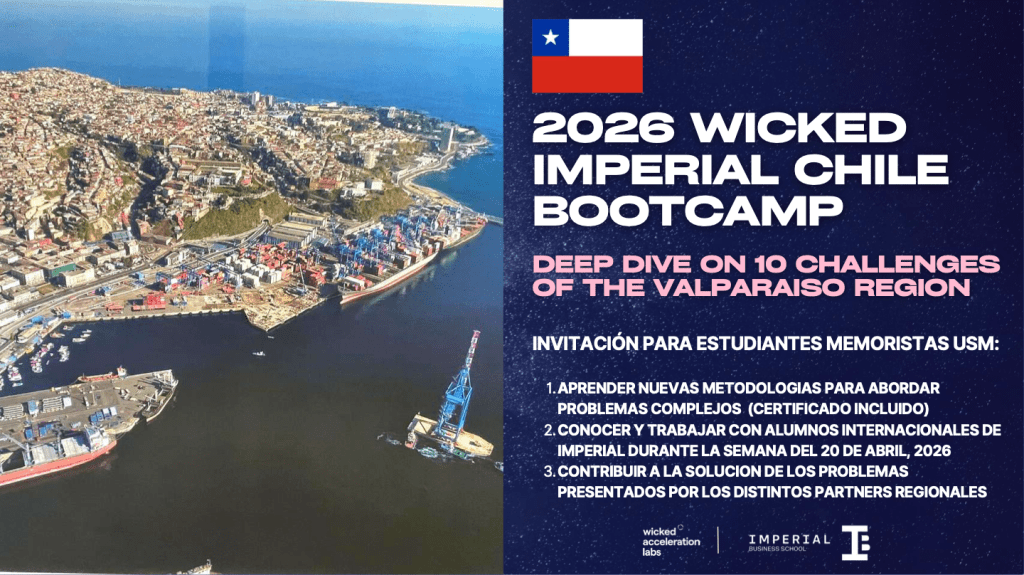 Te invitamos a participar del Wicked Chile Bootcamp 2026, instancia que reúne a estudiantes, académicos, instituciones públicas, empresas y ONGs para abordar 10 desafíos complejos (“Wicked Problems” de la Región de Valparaíso, mediante metodologías de innovación sistémica, diseño y experimentación desarrolladas por Wicked Labs.