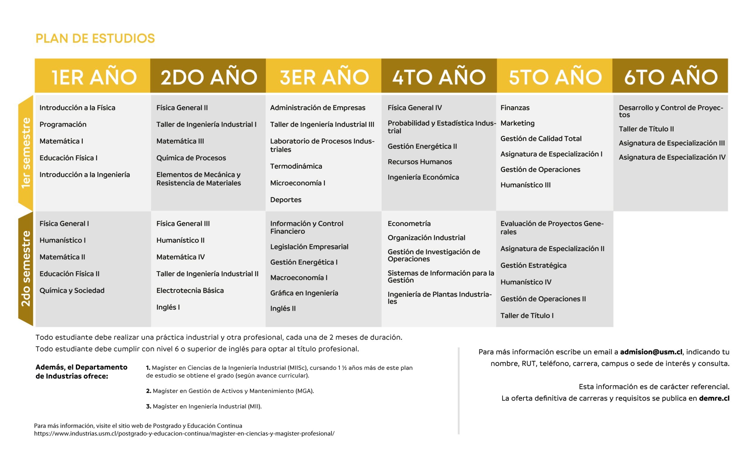 La formación integral, moderna y pertinente que recibe, donde se conjugan e integran fundamentos teóricos, experiencia práctica, y el desarrollo de habilidades personales, sociales y empresariales, en interacción con el medio productivo, hacen del Ingeniero Civil Industrial de la UTFSM un profesional altamente competente, capaz de concebir y desarrollar desde el campo de la ingeniería Industrial, soluciones eficaces y fundamentadas a problemas complejos de la industria y de la comunidad.