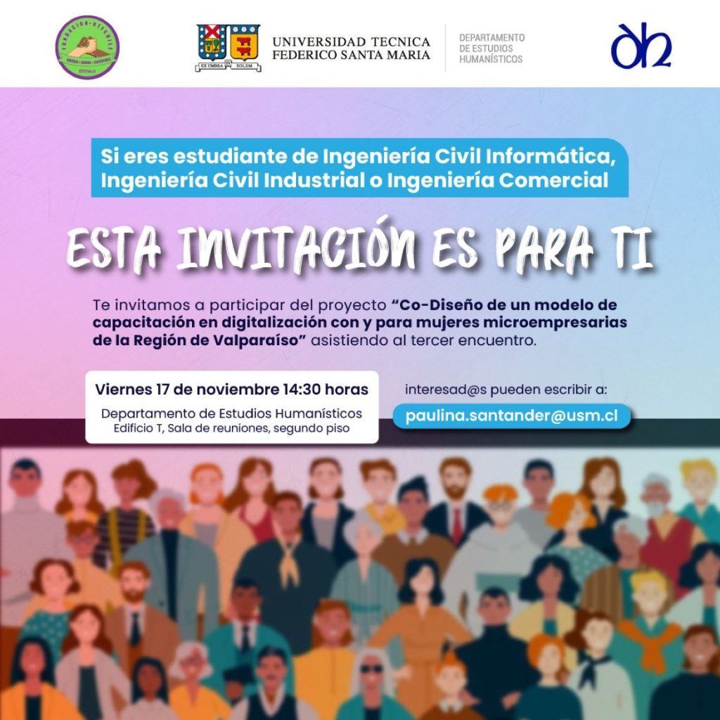 El Departamento de Estudios Humanísticos de la Universidad Técnica Federico Santa María te invitan a participar del 3º Encuentro del Proyecto “Co-Diseño de un Modelo de Capacitación en Digitalización con y para Mujeres Microempresarias de la Región de Valparaíso”.