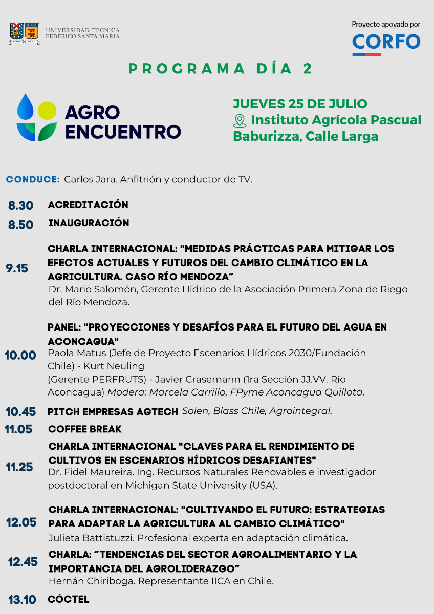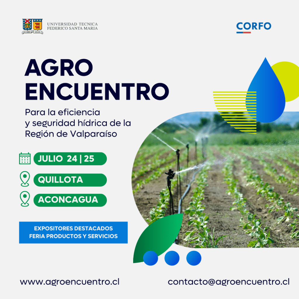 El Departamento de Industrias de la Universidad Técnica Federico Santa María y Corfo Valparaíso, invitan al sector agro al evento de dos días “Agro Encuentro”, programado para los días miércoles 24 y jueves 25 de julio en Quillota y Aconcagua, respectivamente. Este evento cuenta con el apoyo de la Red de Asistencia Digital Fortalece Pyme Aconcagua Quillota, Perfruts FIA y Codesser.