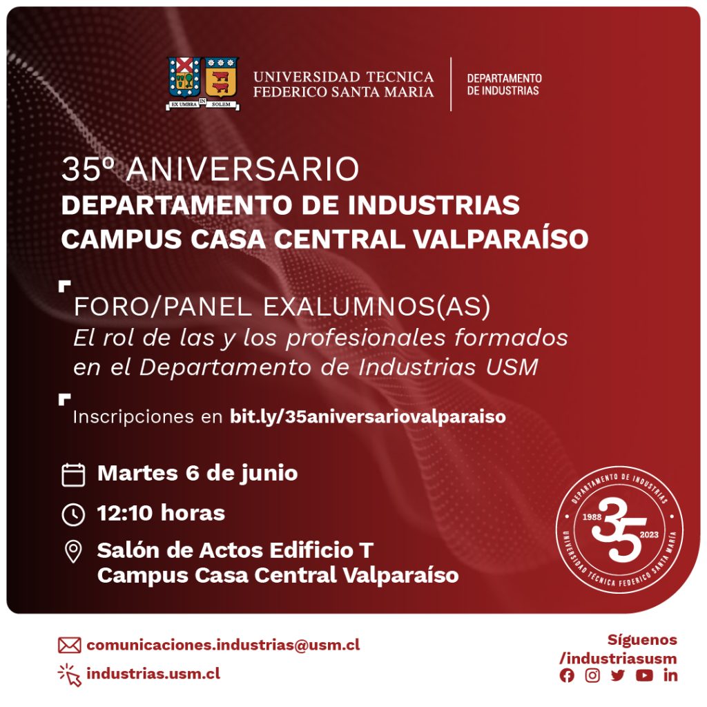 Participa de la Ceremonia de Conmemoración del 35º Aniversario del Departamento de Industrias de la Universidad Técnica Federico Santa María que se realizará en Campus Casa Central Valparaíso, donde contaremos con la presencia de exalumnos y exalumnas quienes expondrán sus experiencias laborales en el marco de un foro/panel que tiene como objetivo visualizar el rol de las y los profesionales formados en la unidad académica.
