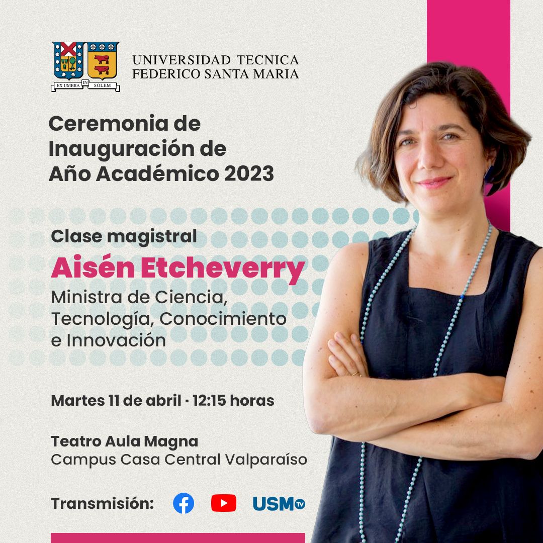 La Universidad Técnica Federico Santa María te invita a participar de la Inauguración del Año Académico 2023, actividad que contará con la charla magistral dictada por la Ministra Aisén Etcheverry Escudero, del Ministerio de Ciencia, Tecnología, Conocimiento e Innovación.