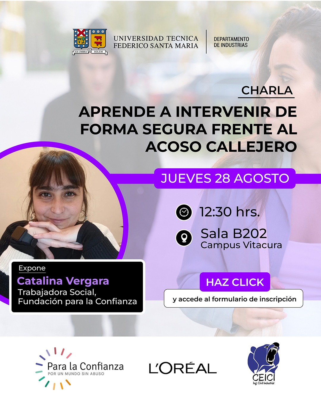 El Centro de Estudiantes de Ingeniería Civil Industrial de Campus Vitacura – CEICI – y L’Oreal te invitan a participar de la Charla “Aprende a Intervenir de Forma Segura frente al Acoso Callejero”, actividad asociada a Stand Up, programa de formación diseñado para ayudar a prevenir el acoso callejero y construir espacios seguros e inclusivos para todos, impulsado por L’Oreal Paris en colaboración con al ONG Right To Be, creando conciencia sobre este problema subestimado y capacitar a las personas sobre cómo reaccionar cuando se enfrentan a él.