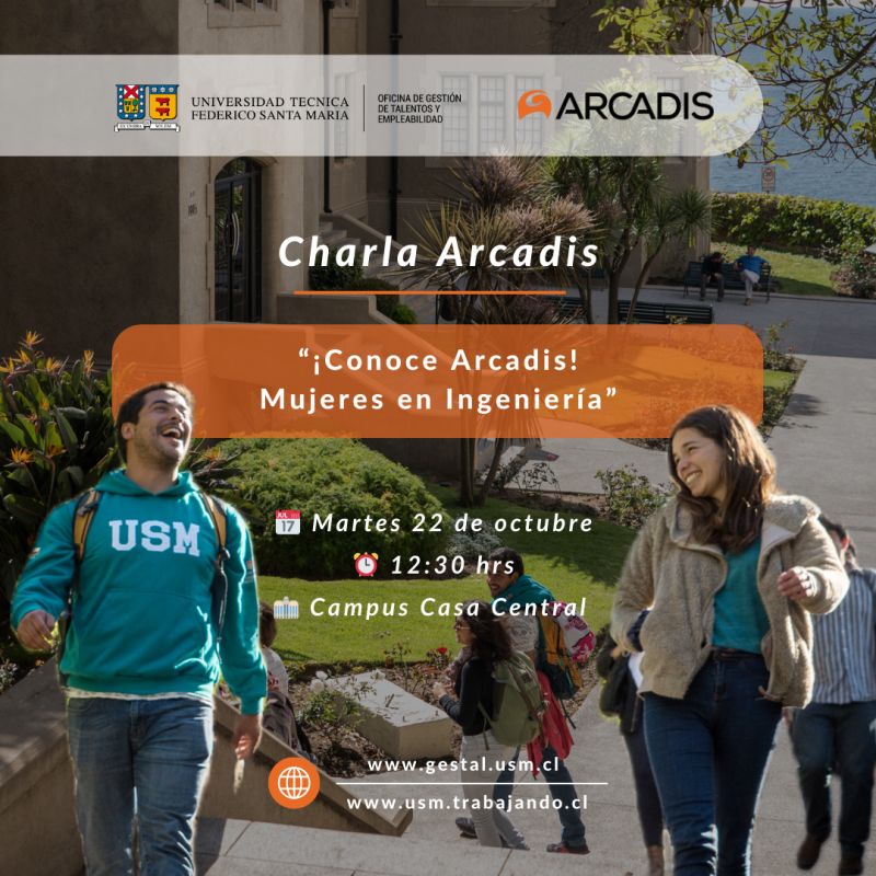 La Oficina de Gestión de Talentos y Empleabilidad de la Universidad Técnica Federico Santa María invita a las y los estudiantes y exalumnos a participar de Charla “¡Conoce la Empresa, sus oportunidades y más!” de Arcadis actividad enmarcada en las Ferias Laborales USM 2024 y que se realizará el día martes 22 de octubre a las 12:30 horas en Campus Casa Central Valparaíso.