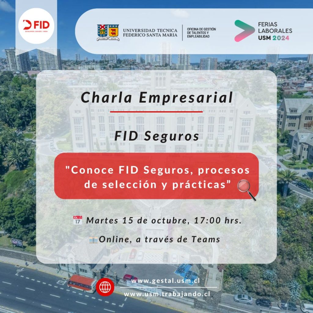 La Oficina de Gestión de Talentos y Empleabilidad de la Universidad Técnica Federico Santa María invita a las y los estudiantes y exalumnos a participar de Charla “¡Conoce la Empresa, sus oportunidades y más!” de FID Seguros actividad enmarcada en las Ferias Laborales USM 2024 y que se realizará el día martes 15 de octubre a las 17:00 horas vía Teams.