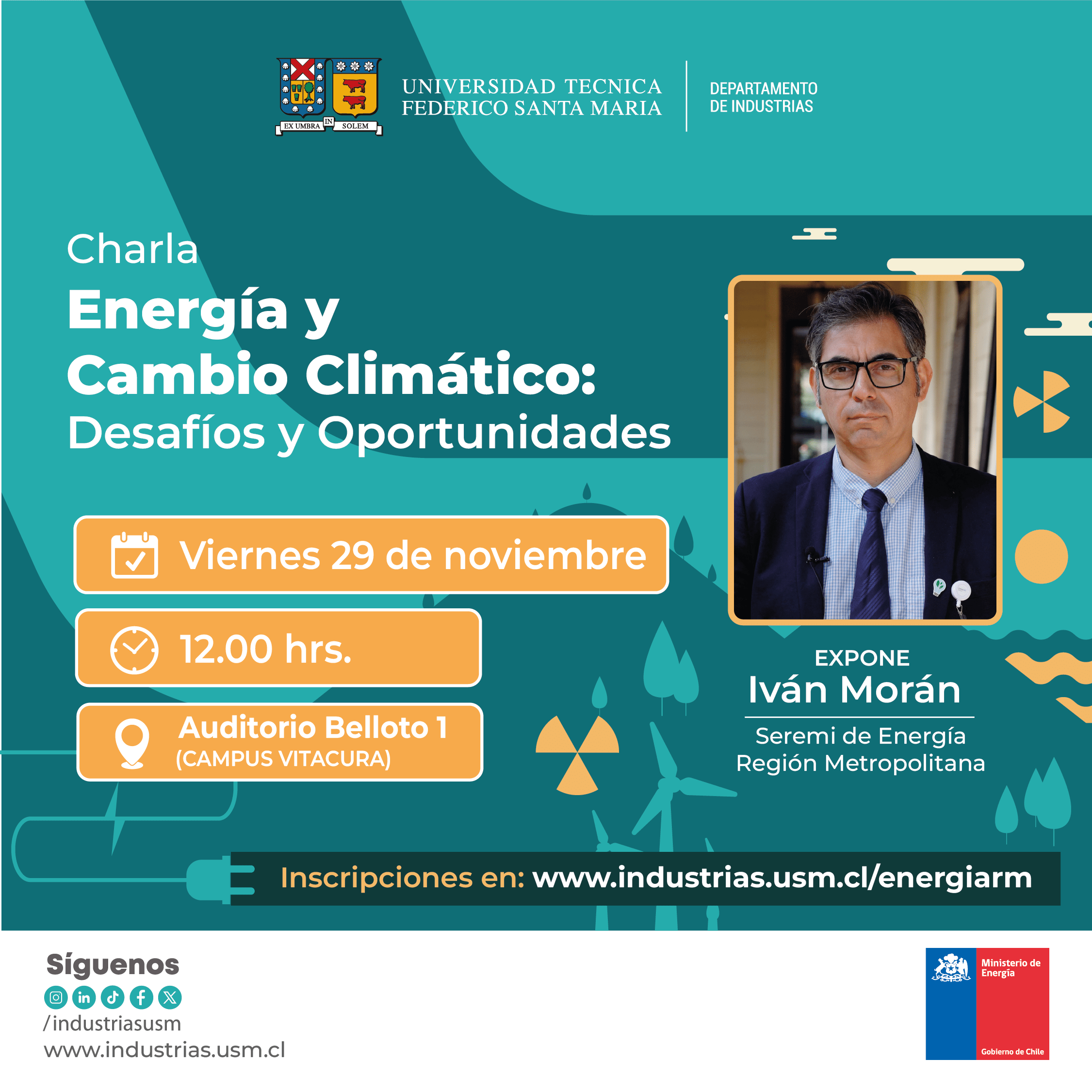 Te invitamos a participar de la Charla “Energía y Cambio Climático: Desafíos y Oportunidades” que el Sr. Iván Morán, Seremi de Energía de la Región Metropolitana, realizará en el Campus Vitacura de la Universidad Técnica Federico Santa María.