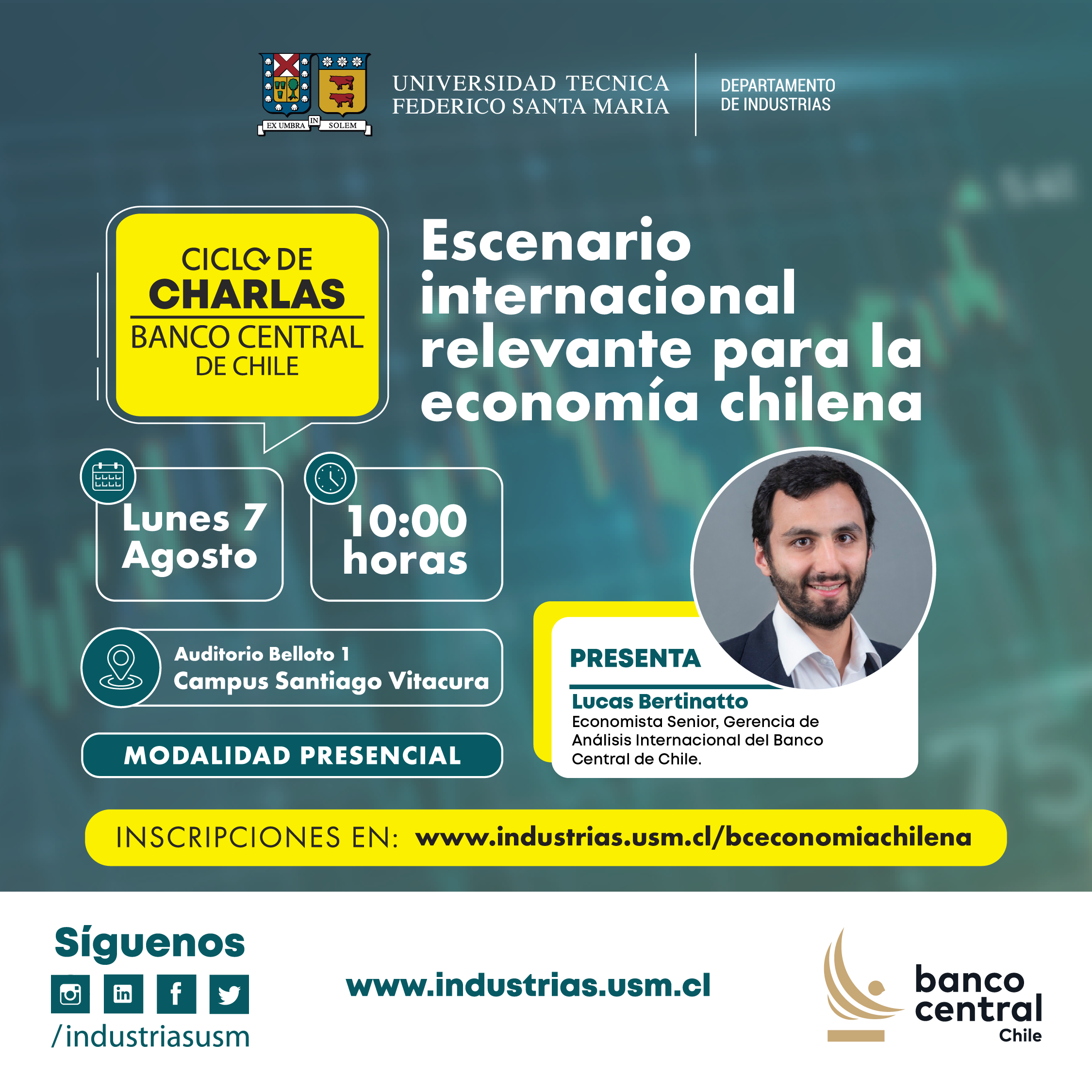 Te invitamos a participar de la Charla “Escenario Internacional relevante para la Economía Chilena” que dictará el Sr. Lucas Pablo Bertinatto, Economista Senior de la Gerencia de Análisis Internacional del Banco Central de Chile en el Campus Santiago Vitacura de la Universidad Técnica Federico Santa María.