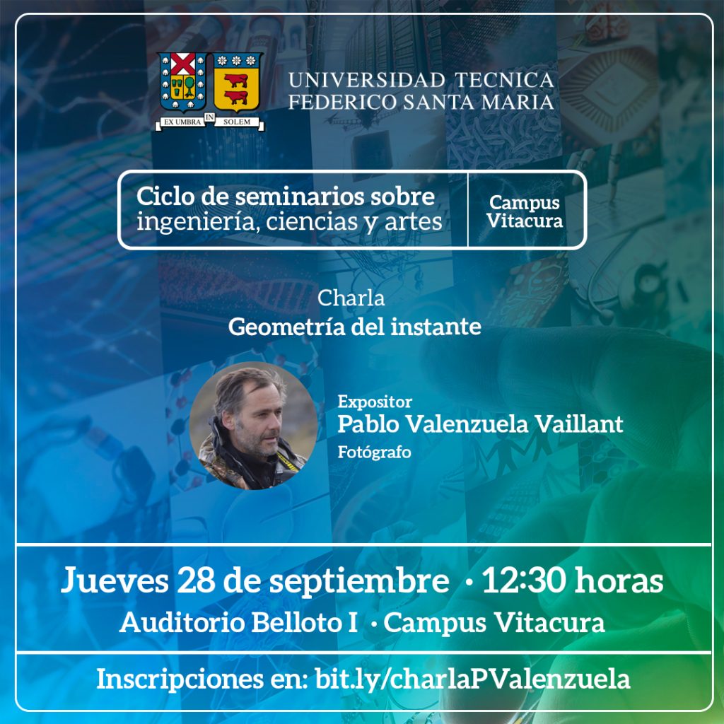 La Dirección General del Campus Vitacura USM te invita a participar de la charla “Geometría del Instante”, dictada por el destacado fotógrafo nacional Pablo Valenzuela, actividad que se encuentra enmarcada en el Ciclo de seminarios sobre ingeniería, ciencias y artes, y que tiene como propósito contribuir a la formación de la comunidad universitaria.