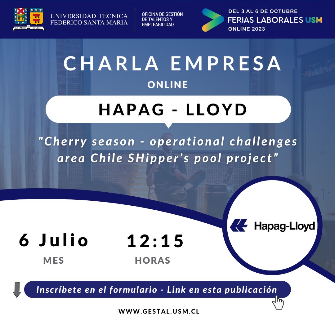 HAPAG LLOYD AG, líder mundial en el transporte de contenedores especializada en la carga refrigerada, mercancías peligrosas y proyectos de carga especial, y la Oficina de Gestión de Talentos y Empleabilidad – GESTAL USM, te invitan a participar de la Charla “Cherry Season – Operational Challenges area Chile Shipper’s Pool Project”, en el marco de las Ferias Laborales 2023.