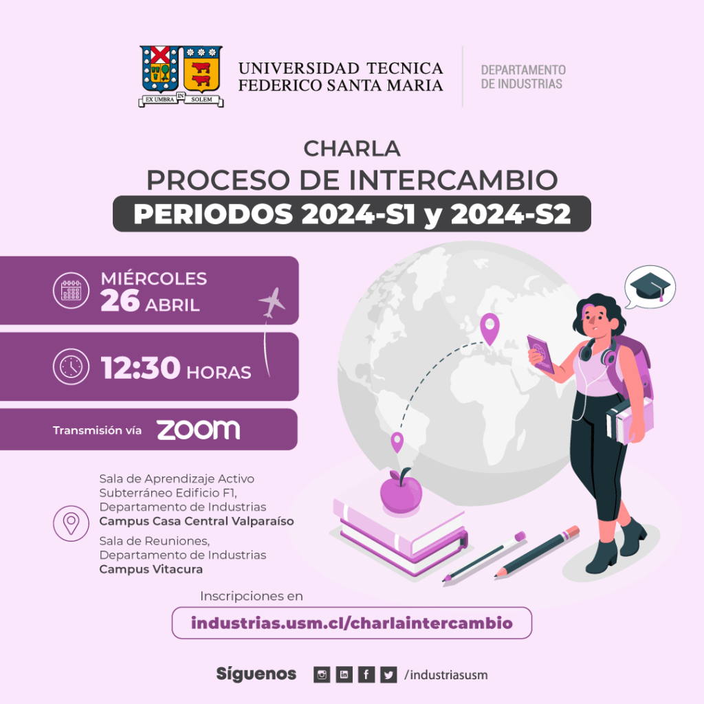 Si estás cursando Ingeniería Civil Industrial USM te invitamos a participar de la Charla Informativa sobre el Proceso de Intercambio Internacional que realizará el Coordinador de Intercambios del Departamento de Industrias, Dr. Pablo Viveros G., en modalidad presencial y online, donde podrás conocer los requisitos para participar del intercambio durante el 1º y/o 2º semestre 2024, el procedimiento para convalidar las asignaturas, los documentos que debes gestionar con el Coordinador de Intercambios, entre otros.