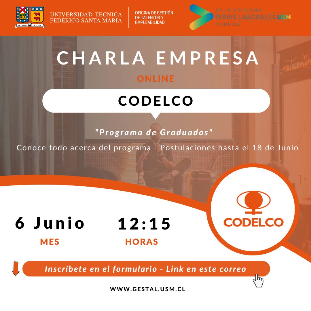CODELCO y la Oficina de Gestión de Talentos y Empleabilidad USM invitan a las y los egresados y titulados de INGENIERÍA CIVIL INDUSTRIAL USM a participar de la charla informativa relacionada al PROGRAMA DE GRADUADOS(AS) 2023 de la compañía, mediante el cual busca a las y los mejores jóvenes profesionales, con capacidad de liderazgo y orientación a la excelencia para impulsar la transformación minera del futuro para Chile.
