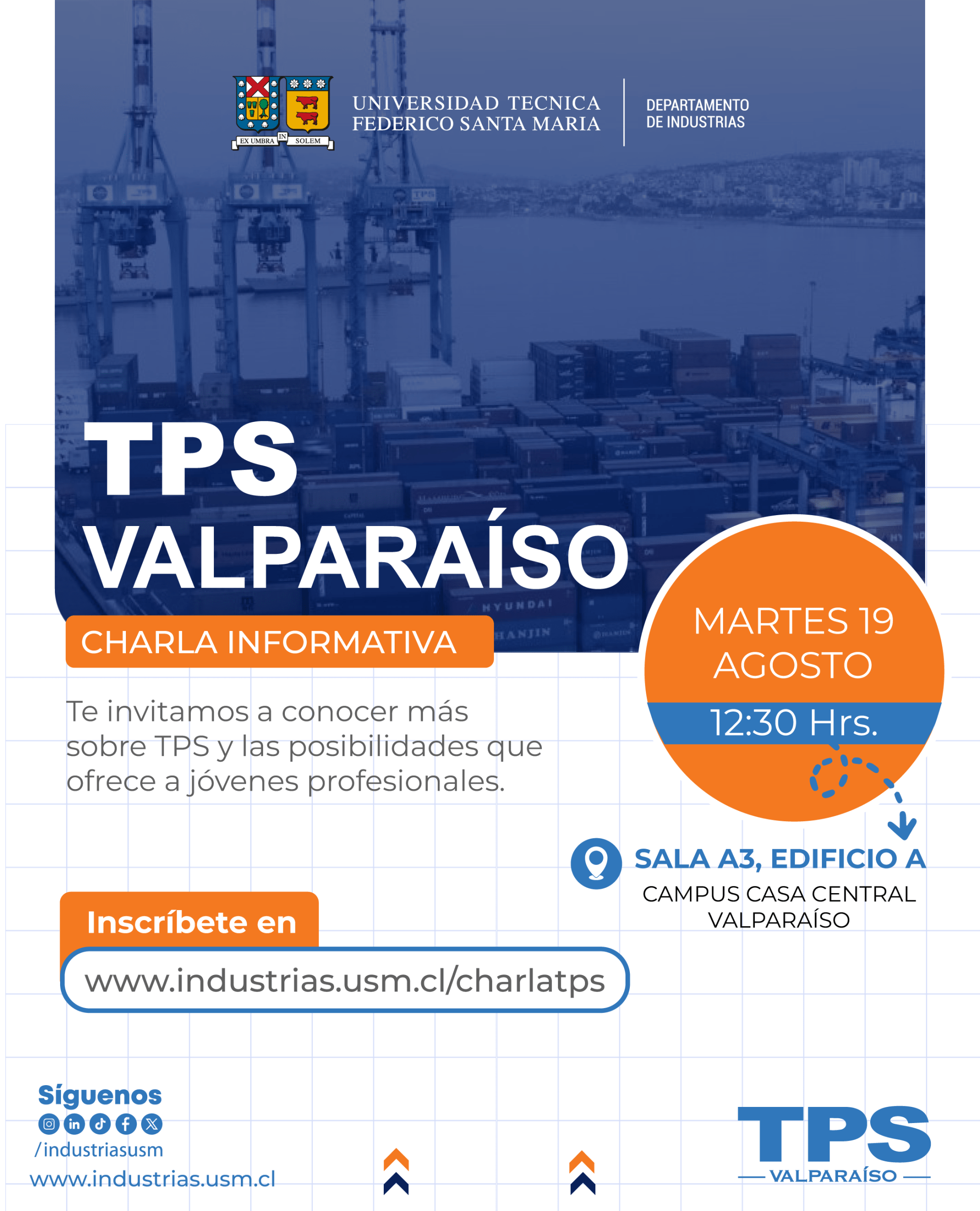 TPS Valparaíso y el Departamento de Industrias USM te invitan a participar de la Charla Informativa que realizará la compañía en Campus Casa Central Valparaíso de la Universidad Técnica Federico Santa María, dirigida a estudiantes, egresados(as) y/o titulados(as) de Ingeniería Civil Industrial, donde se presentará que quehacer de la empresa y el rol de las y los Ingenieros Civiles Industriales al interior de la organización.