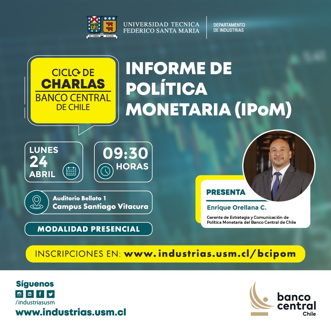 Te invitamos a participar de la Charla “Informe de Política Monetaria (IPoM)” que dictará el Sr. Enrique Orellana C., Gerente de Estrategia y Comunicación de Política Monetaria del Banco Central de Chile en el Campus Santiago Vitacura de la Universidad Técnica Federico Santa María.
