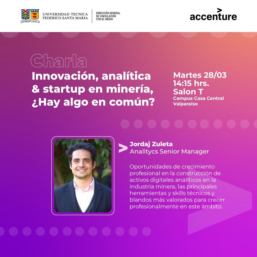 La Dirección General de Vinculación con el Medio de la Universidad Técnica Federico Santa María en conjunto a Accenture, te invita a participar de la Charla “Innovación, Analítica & StartUp en Minería, ¿Hay algo en común?” donde Jordaj Zuleta, Analitycs Senior Manager para la Industria Minera de Accenture, mostrará las oportunidades de crecimiento profesional en la construcción de activos digitales analíticos en la industria minera, las principales herramientas y skills técnicos y blandos más valorados para crecer profesionalmente en este ámbito.