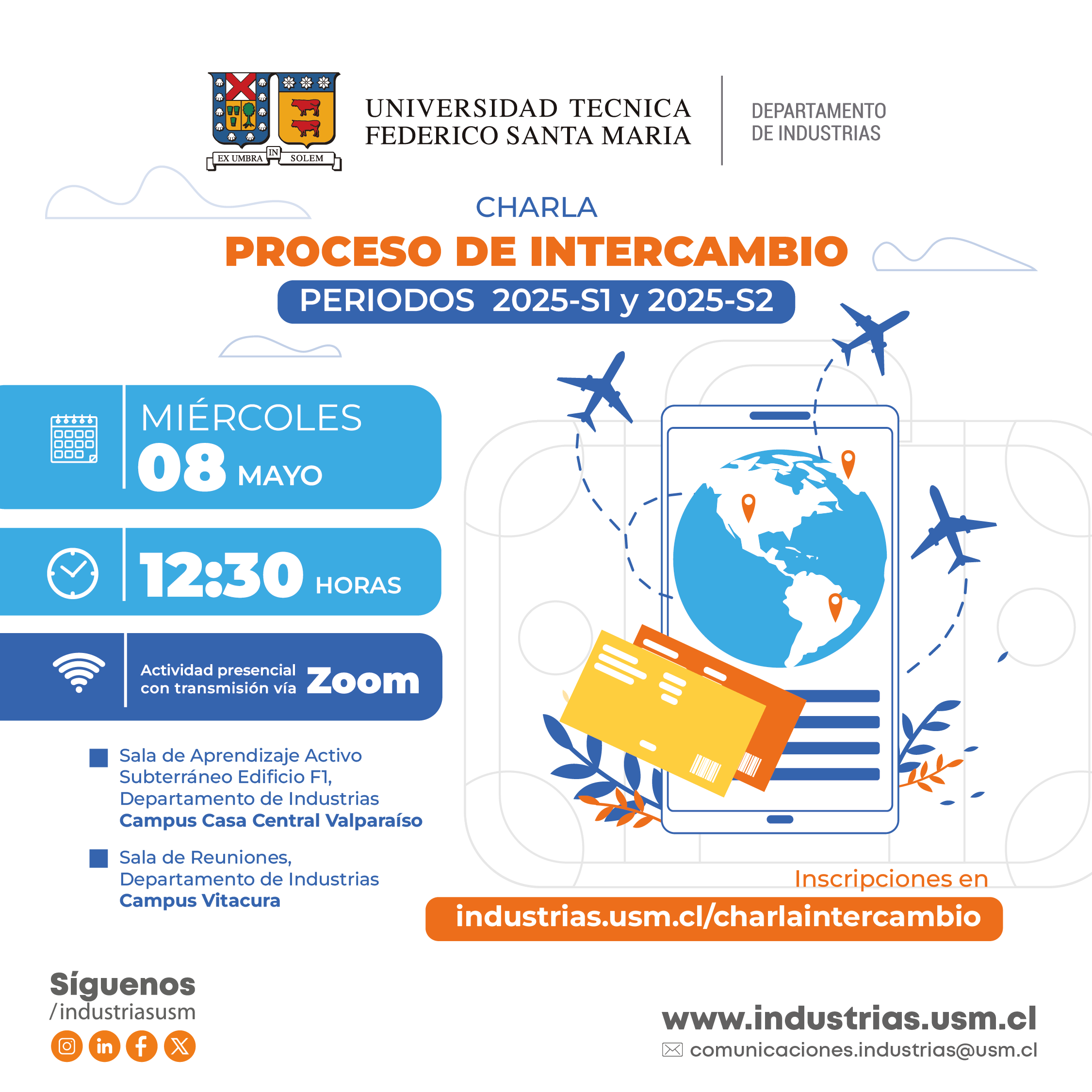 Si estás cursando Ingeniería Civil Industrial USM te invitamos a participar de la Charla Informativa sobre el Proceso de Intercambio Internacional que realizará el Coordinador de Intercambios del Departamento de Industrias, Dr. Pablo Viveros G., en modalidad presencial y online, donde podrás conocer los requisitos para participar del intercambio durante el 1º y/o 2º semestre 2025, el procedimiento para convalidar las asignaturas, los documentos que debes gestionar con el Coordinador de Intercambios, entre otros.