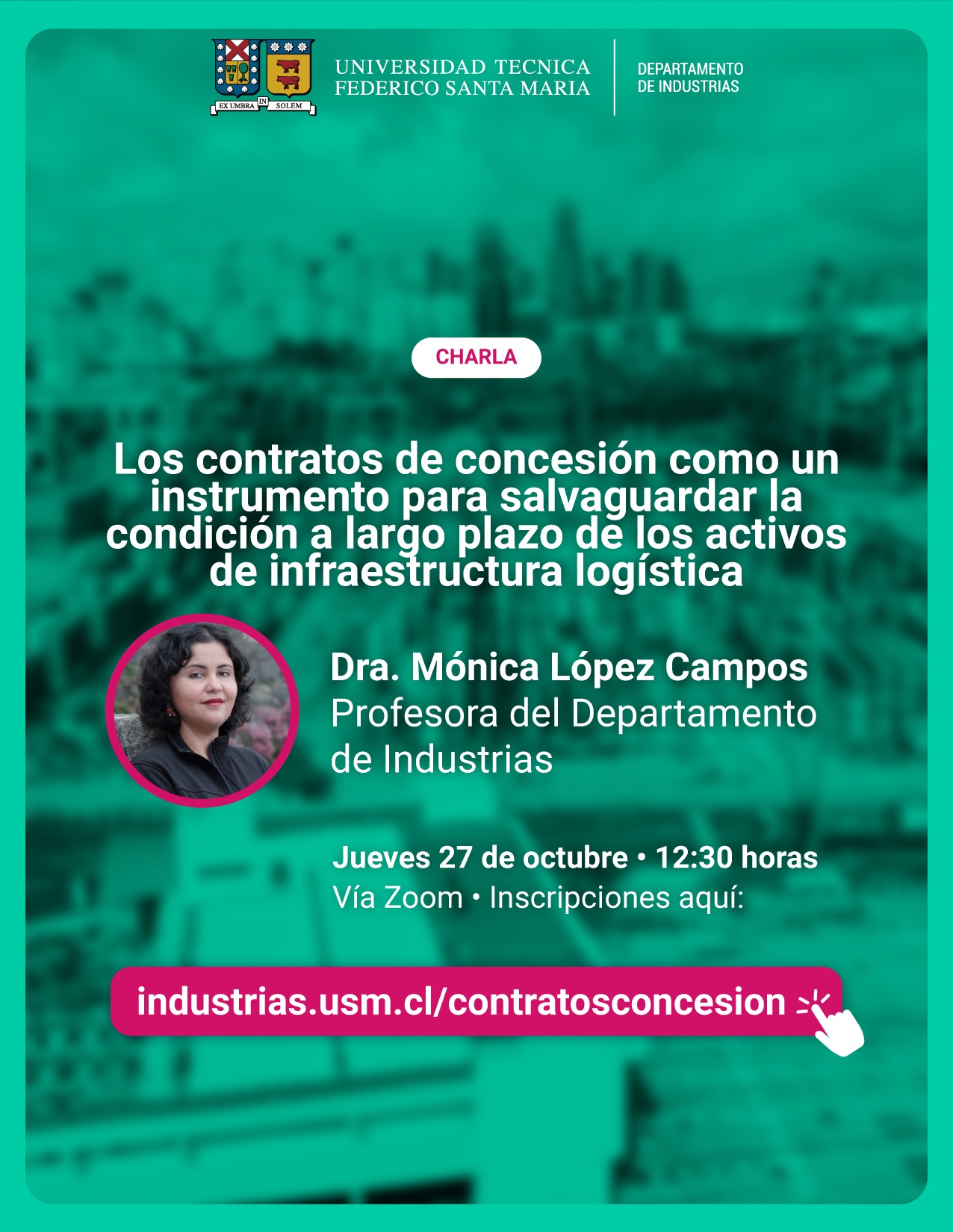 Te invitamos a participar de la Charla «Los Contratos de Concesión como un instrumento para salvaguardar la condición a largo plazo de los Activos de Infraestructura Logística», a cargo de la Dra. Mónica López Campos, Académica del Departamento de Industrias de la Universidad Técnica Federico Santa Maria, en el marco de la conmemoración del «Mes de las Ciencias, la Tecnología, el Conocimiento y la Innovación» en su versión 2022.