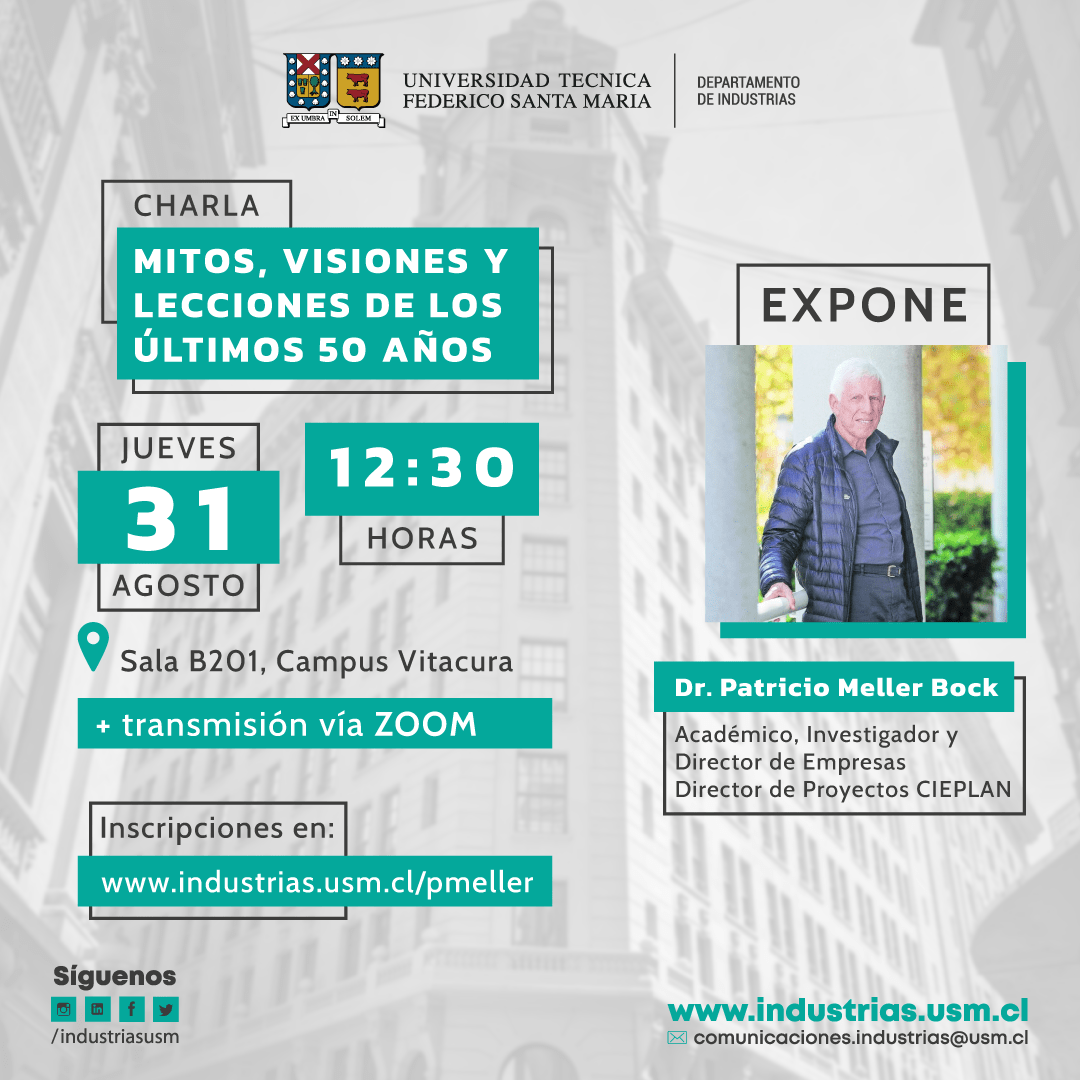 Te invitamos a participar de la Charla “Mitos, Visiones y Lecciones de los últimos 50 años” que dictará el Dr. Patricio Meller Bock, Investigador Senior y Director de Proyectos de la Corporación de Estudios para Latinoamérica (CIEPLN), en el Campus Santiago Vitacura de la Universidad Técnica Federico Santa María.