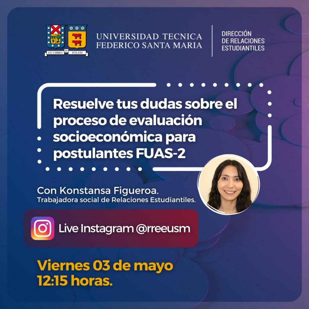 Este viernes 03 de mayo, a las 12:15 horas, a través de Live Instagram @rreeusm_valparaiso, Konstansa Figueroa, trabajadora social de la Dirección de Relaciones Estudiantiles, aclarará todas las dudas en torno a aquellos que postularon al FUAS en el proceso de febrero-marzo y que no les aparece pila en el resultado de nivel socioeconómico del Ministerio de Educación (Mineduc).
