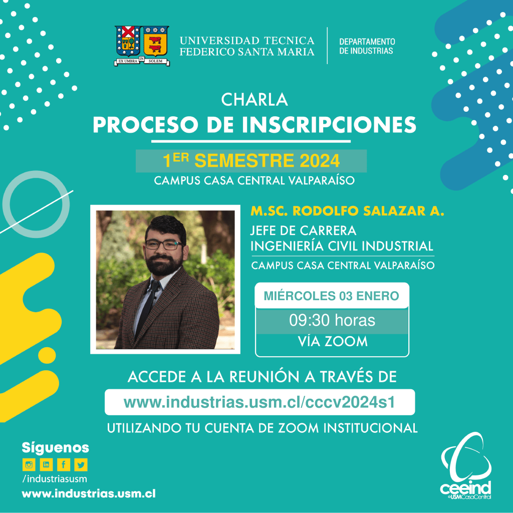 Te invitamos a participar mañana miércoles 03 de enero 2024 a las 09:30 horas, a través de Zoom, de la charla que realizará el Jefe de Carrera de Ingeniería Civil Industrial en Campus Casa Central Valparaíso, M.Sc. Rodolfo Salazar Albornoz, respecto del Proceso de Inscripciones de Asignaturas para el 1º semestre 2024, mediante la cual responderá consultas específicas de las y los estudiantes y presentará algunas generalidades, indicaciones y respuesta a preguntas frecuentes de este proceso, así como también el alcance que tiene la Jefatura de Carrera u otras unidades de nuestra Universidad en procesos o solicitudes específicas.