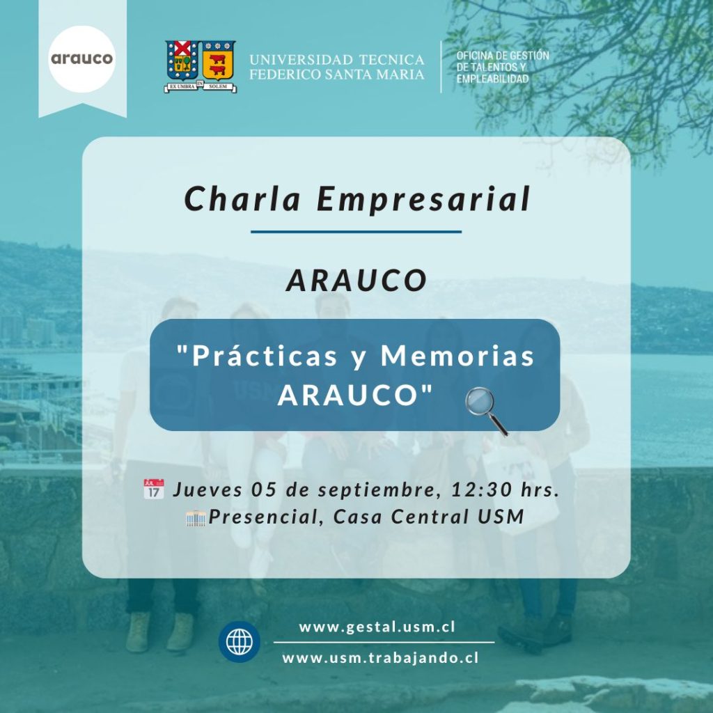 La Oficina de Gestión de Talentos y Empleabilidad de la Universidad Técnica Federico Santa María invita a las y los estudiantes y exalumnos a participar de la Charla “Programa de Prácticas y Memorias” de Arauco, actividad enmarcada en las Ferias Laborales USM 2024 y que se realizará el día jueves 05 de septiembre a las 12:30 horas en la Sala C225, Campus Casa Central Valparaíso.