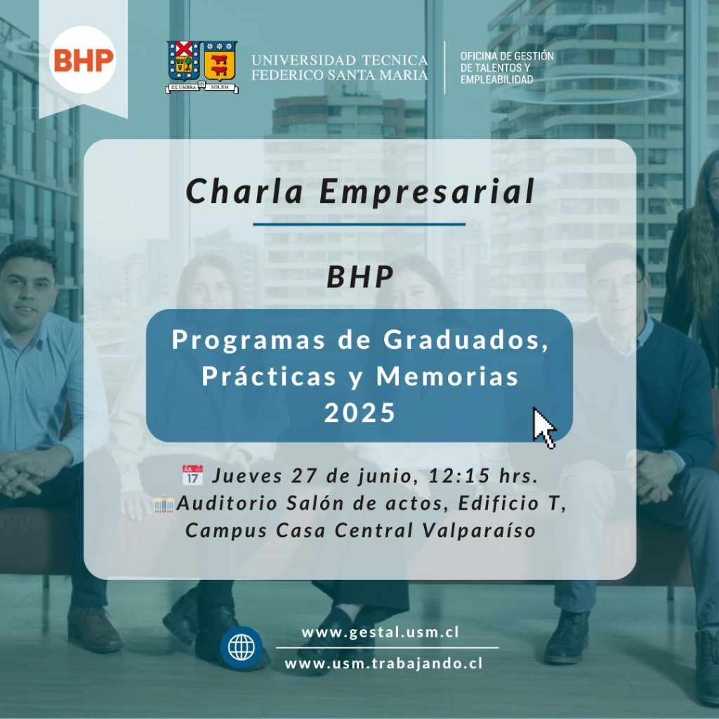 BHP y la Oficina de Gestión de Talentos y Empleabilidad – GESTAL USM, invita a estudiantes, egresados(as) y titulados(as) de Ingeniería Civil Industrial USM a participar de la Charla Informativa de los Programas de Graduados(as), Prácticas y Memorias 2025 de la compañía.