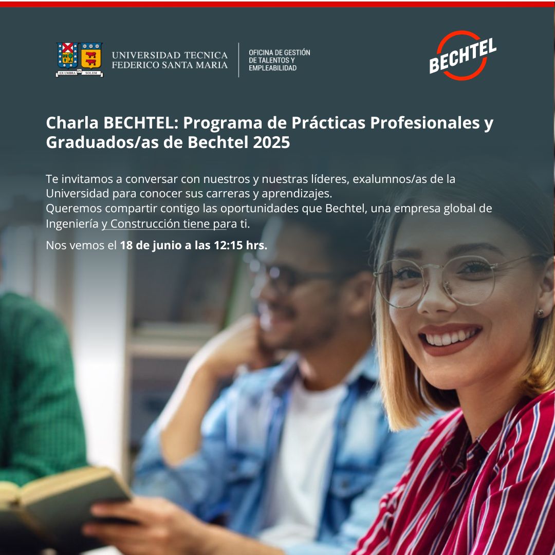 BECHTEL y la Oficina de Gestión de Talentos y Empleabilidad – GESTAL USM, invita a estudiantes, egresados(as) y titulados(as) de Ingeniería Civil Industrial USM a participar de la Charla Informativa de los Programas de Prácticas Profesionales y Graduados(as) 2025 de la compañía global de Ingeniería y Construcción.