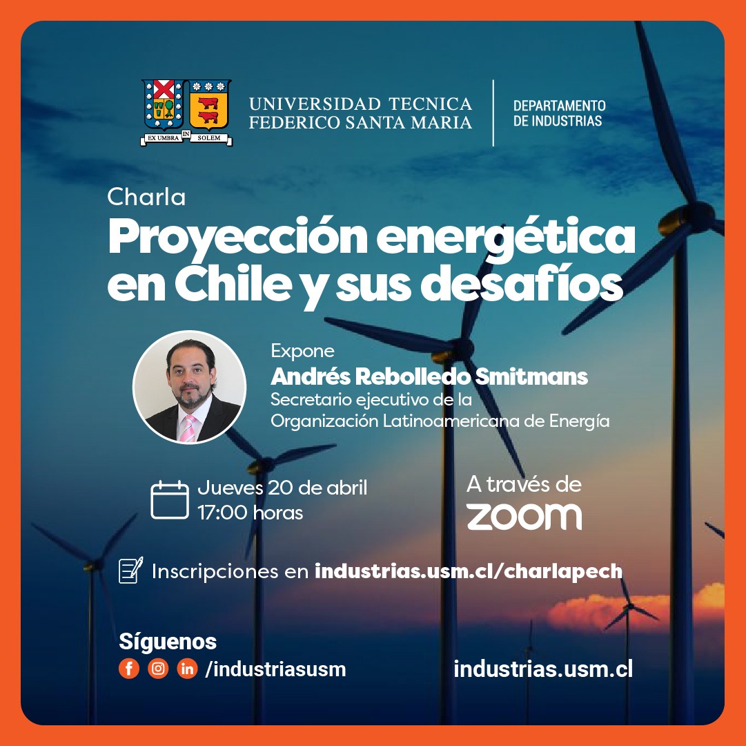 Te invitamos a participar de la Charla “Proyección Energética para Chile y sus Desafíos” que dictará el Sr. Andrés Rebolledo Smitmans, Secretario Ejecutivo de la Organización Latinoamericana de Energía para el periodo 2023-2025 y que cuenta con más de 30 años de trayectoria en cargos técnicos de liderazgo y responsabilidad política en ámbitos del sector energético, de las relaciones económicas internacionales y organismos multilaterales.