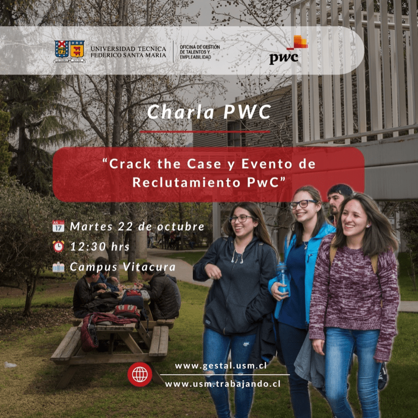 La Oficina de Gestión de Talentos y Empleabilidad de la Universidad Técnica Federico Santa María invita a las y los estudiantes y exalumnos a participar de Charla PwC “Crack the Case y Evento de Reclutamiento”actividad enmarcada en las Ferias Laborales USM 2024 y que se realizará el día martes 22 de octubre a las 12:30 horas en Campus Vitacura.